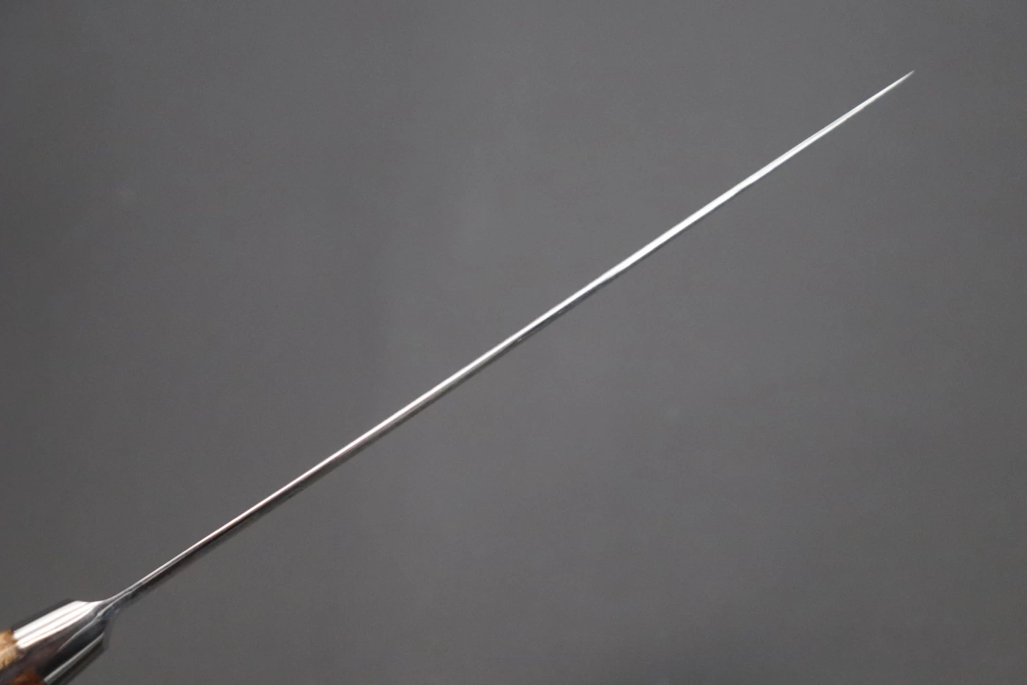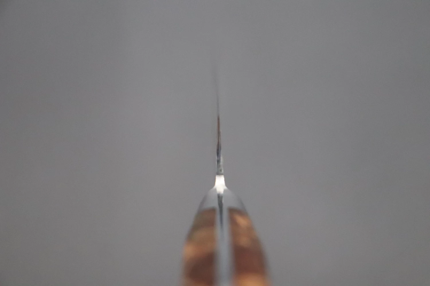 In order to satisfy new market demands, including those of a large number of experienced users and knife enthusiasts, Master Gotou has been refining his techniques for making a new generation of special steel knives. Master Gotou selected a special Powdered Metallurgy High Speed Tool Steel called “R-2”, which he heat treats to HRc. 63. R-2 is produced by a highly reputable Japanese company called Kobelco and offers remarkable cutting performance and edge retention.