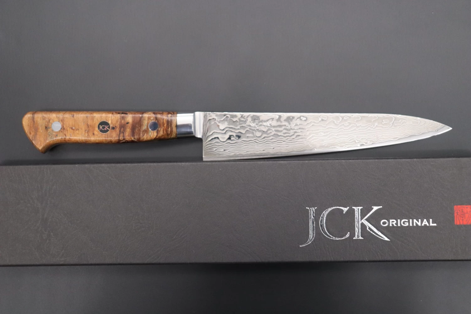 Knife Model: JCK Original Kagayaki NOVEL- Limited Edition Custom R-2 Damascus Series KNLTD-87 Petty 150mm (Hammer Forged Blade)
