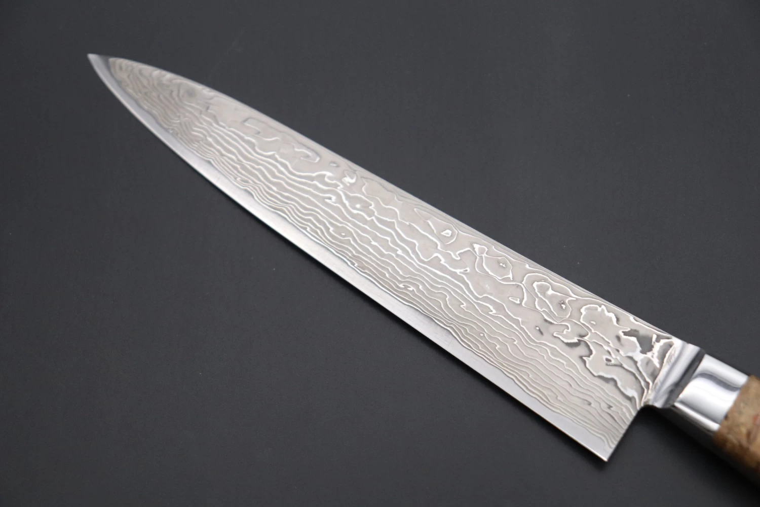 KAGAYAKI NOVEL R-2 Custom Damascus KNLTD-95 Petty 150mm Knife comes with a Beautiful Natural Wood Grain texture, Custom Handmade Stabilized Spalted Wood handle, that is carefully hand countered and polished to ensure a comfortable&secure grip and beautiful appearance. Each knife is supplied with a matching wooden Saya (Sheath), which has been finished with a decorative black lacquer that complements the appearance of the Dark Damascus blade very well.