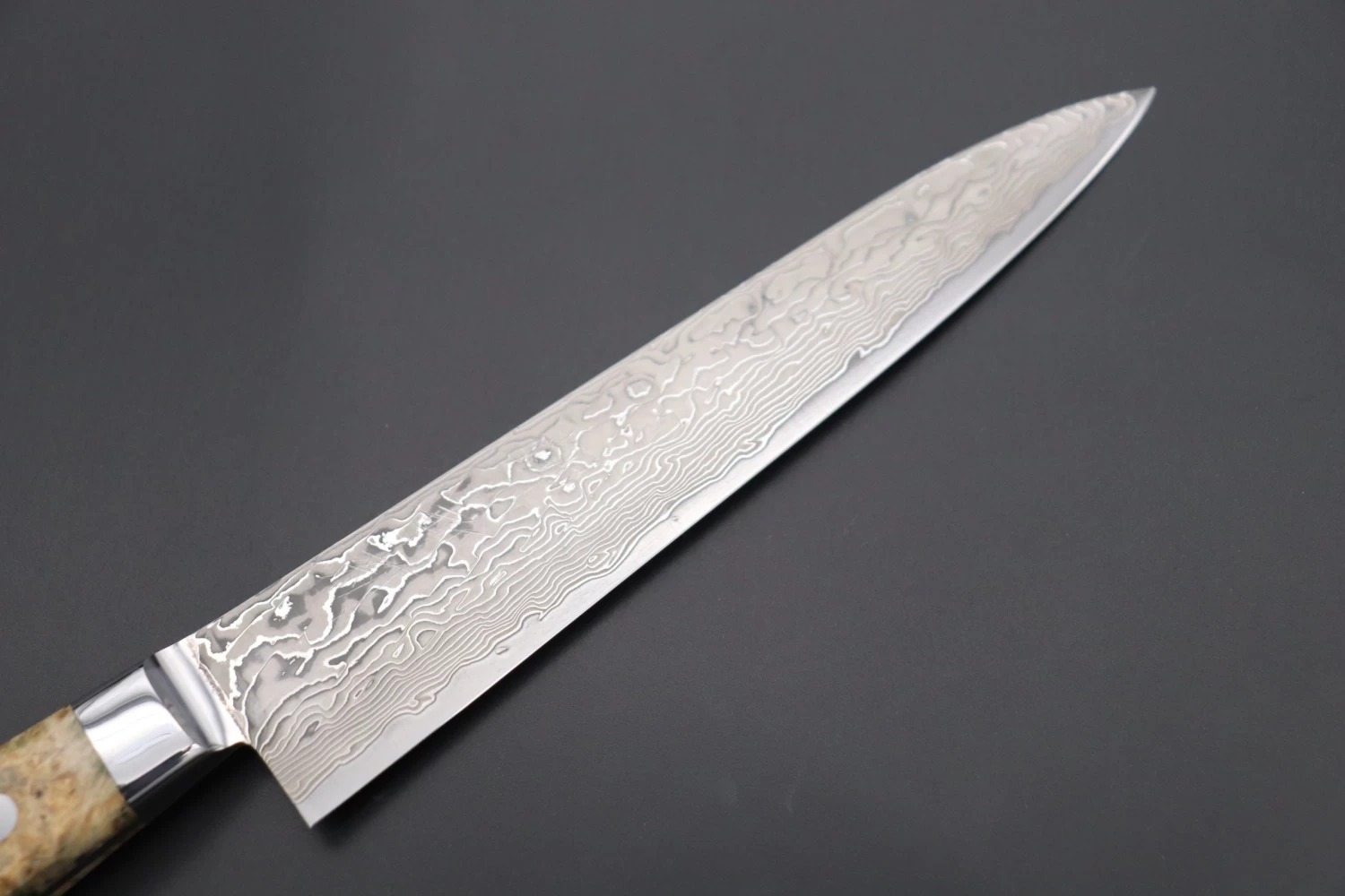 One day, at a large US Knife Show, we unexpectedly discovered this Natural Wood Color Stabilized Hybrid Wood material. We decided to ask Master Gotoh to combine this special wood with his highest quality Traditionally Forged R-2 Damascus blades. Now, the KAGAYAKI NOVEL-Limited Edition Custom Series is ready and available!