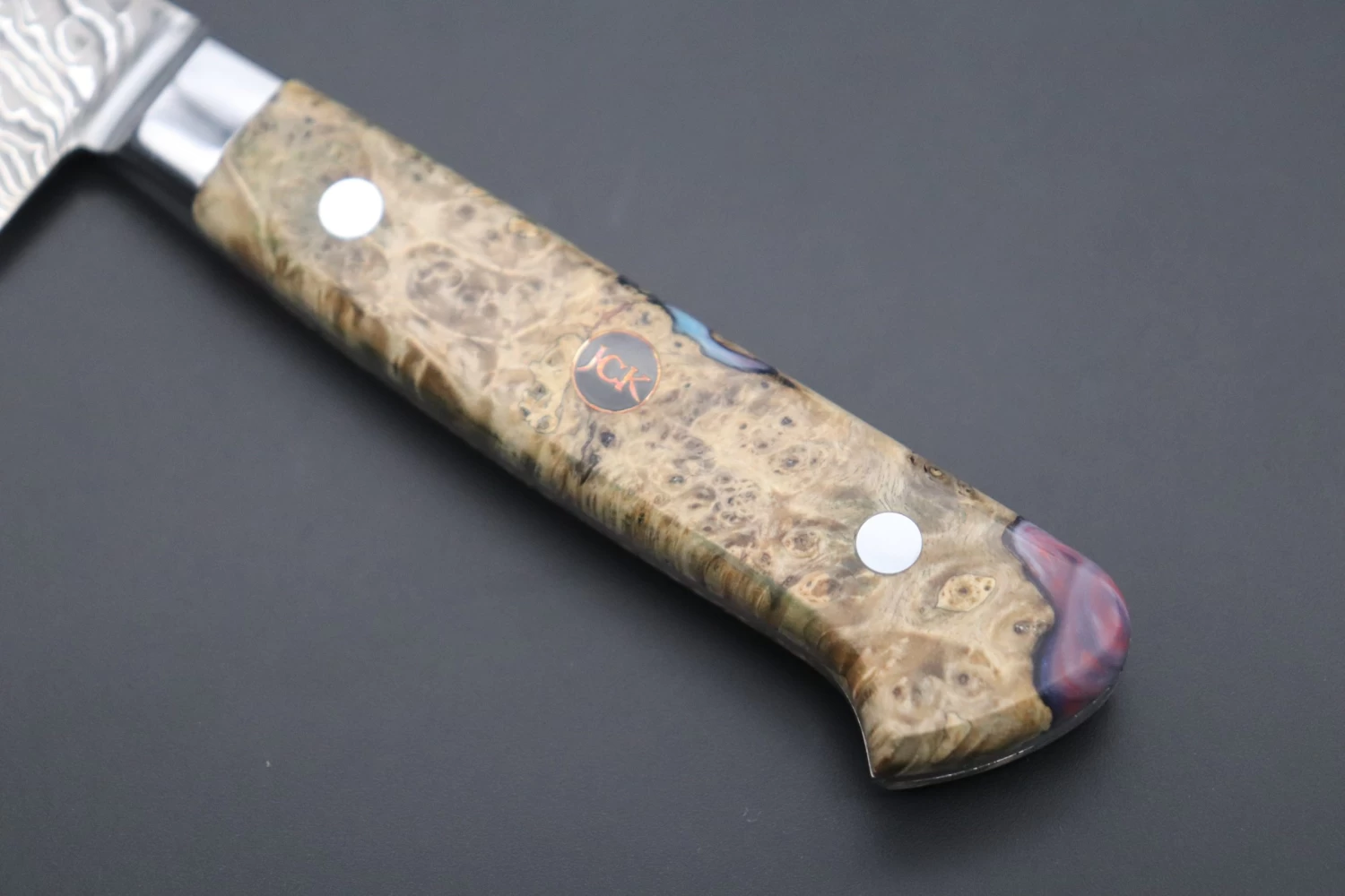 The knives feature full tang construction, premium handle scales, perfectly mirror polished stainless steel bolster and a Handmade “JCK” Mosaic Pin that adds a stylish design accent.