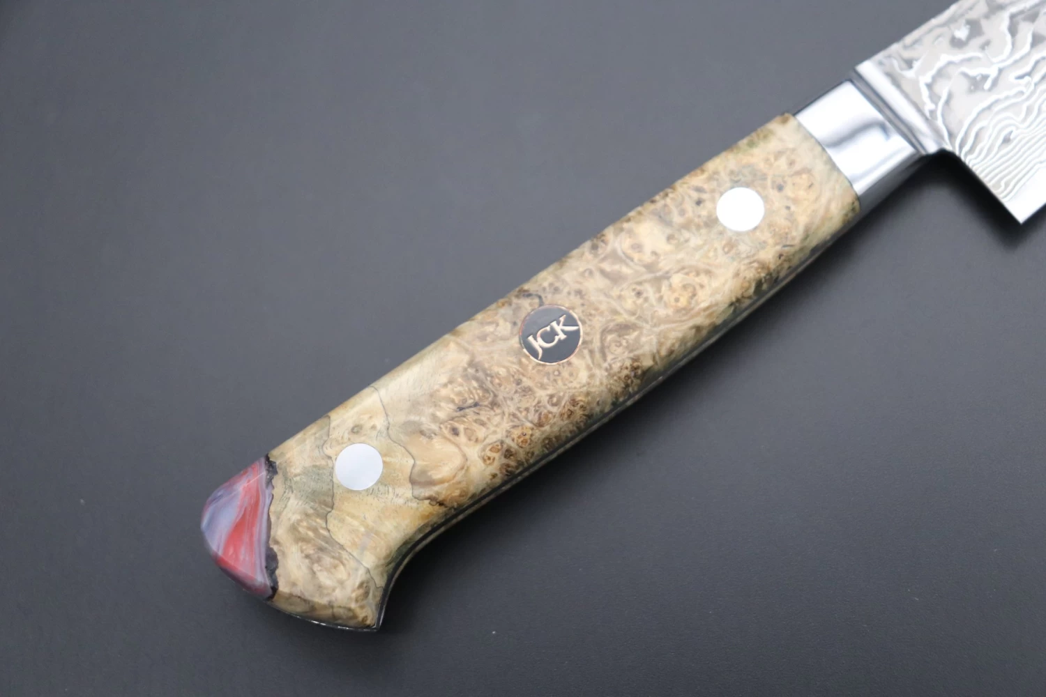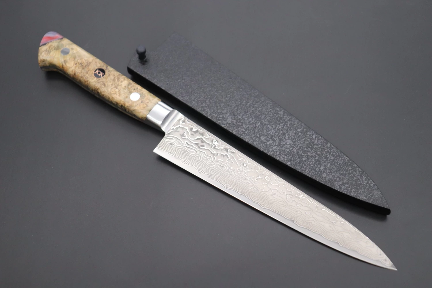 KAGAYAKI NOVEL R-2 Custom Damascus KNLTD-98 Petty 150mm Knife comes with a Custom Handmade, Natural Wood Color Stabilized Hybrid Wood Handle, that is carefully hand countered and polished to ensure a comfortable&secure grip and beautiful appearance. Each knife is supplied with a matching wooden Saya (Sheath), which has been finished with a decorative black lacquer that complements the appearance of the Dark Damascus blade very well.