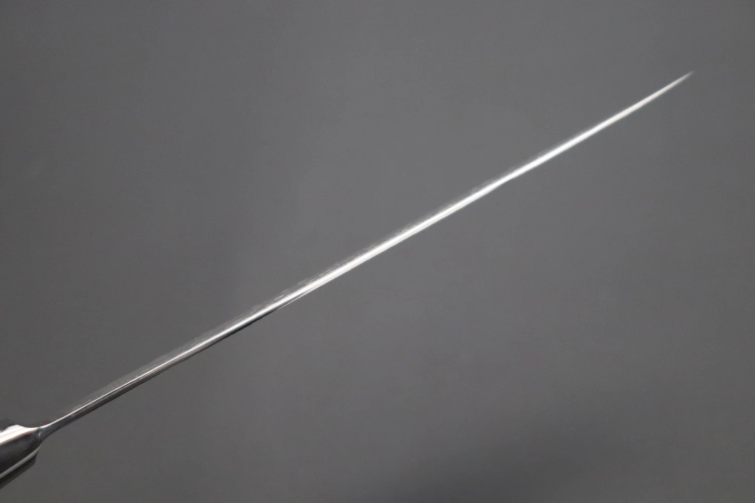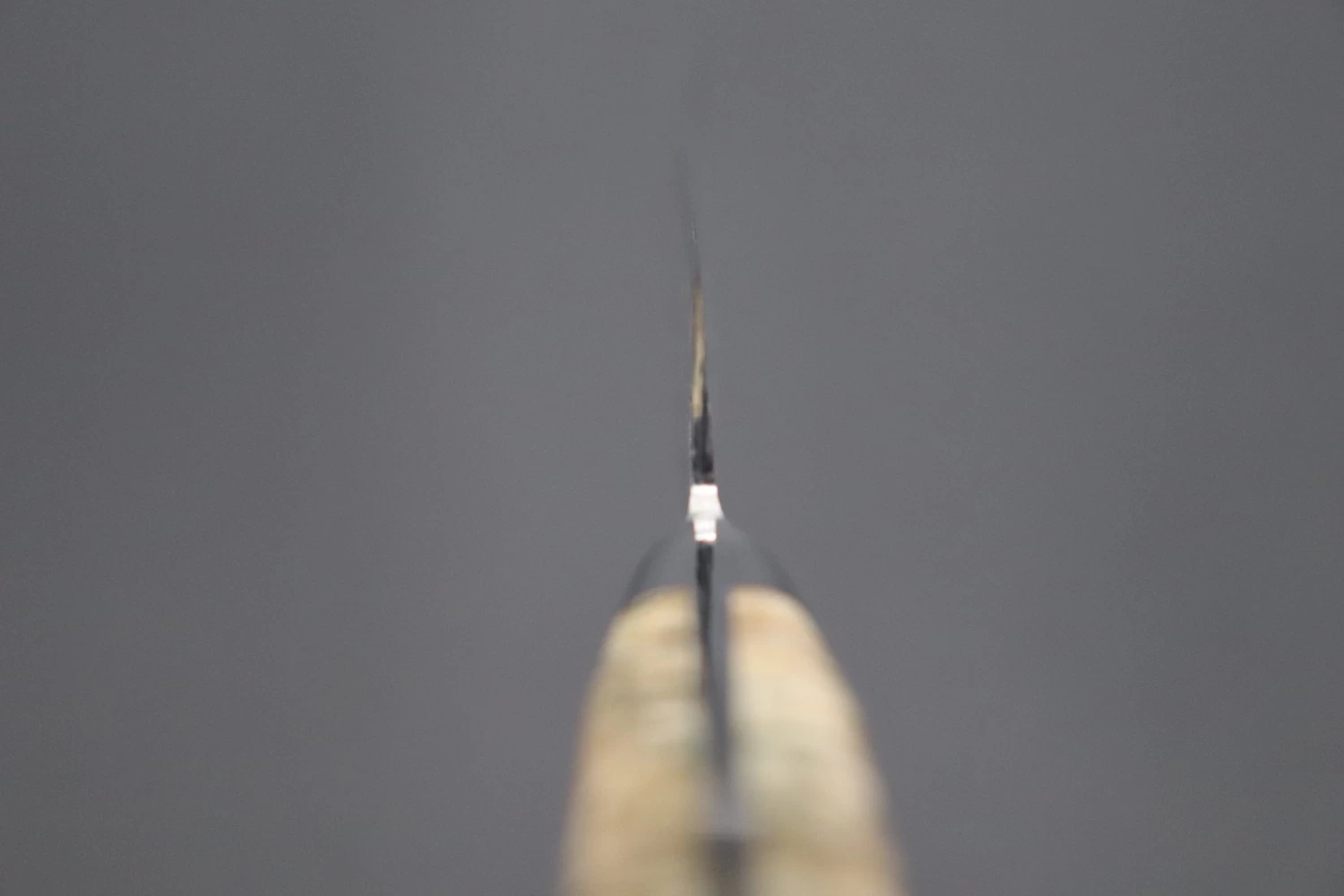 In order to satisfy new market demands, including those of a large number of experienced users and knife enthusiasts, Master Gotou has been refining his techniques for making a new generation of special steel knives. Master Gotou selected a special Powdered Metallurgy High Speed Tool Steel called “R-2”, which he heat treats to HRc. 63. R-2 is produced by a highly reputable Japanese company called Kobelco and offers remarkable cutting performance and edge retention.