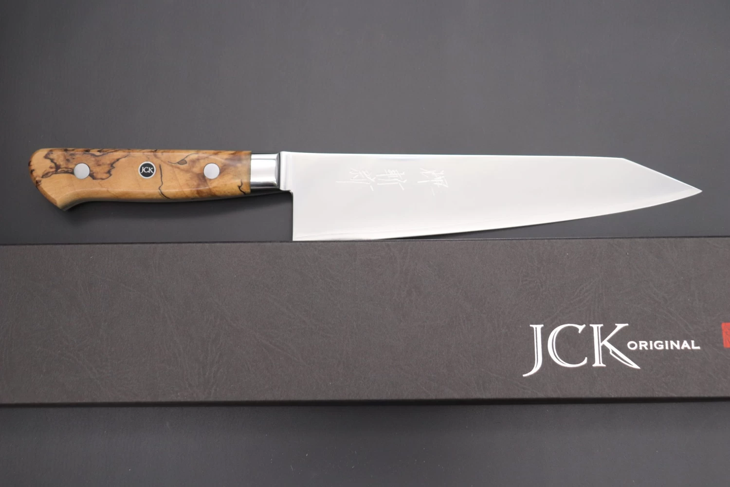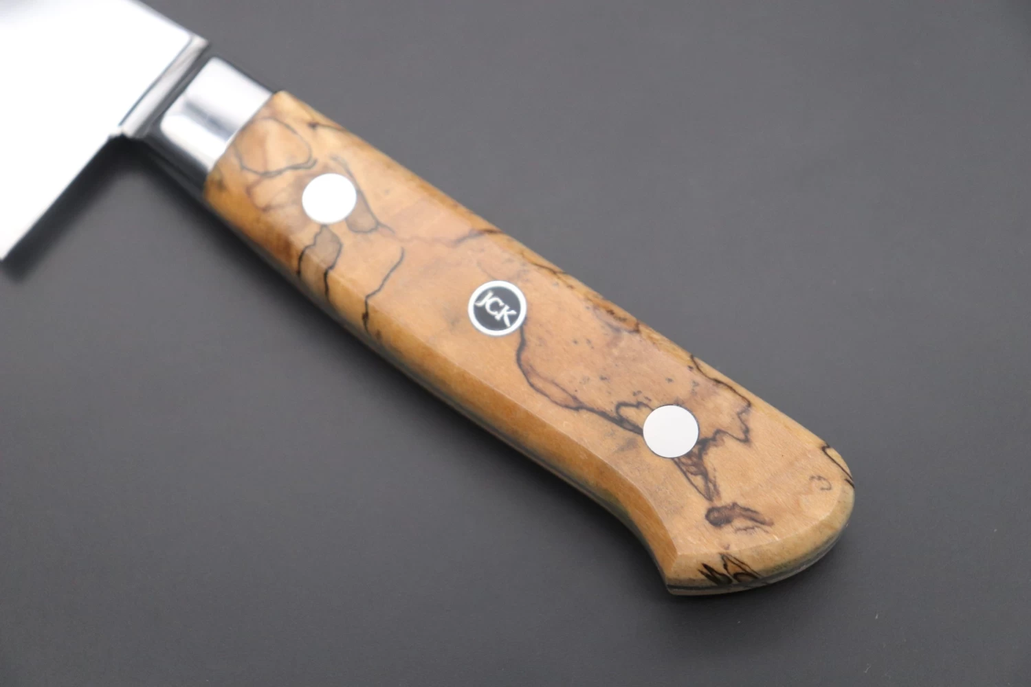 The knives feature full tang construction, premium handle scales, a perfectly mirror polished stainless steel bolster and a Handmade “JCK” Mosaic Pin that adds a stylish design accent. The bolster and blade tang are beautifully mirror polished to match the magnificent blade, and the forged stainless steel bolster provides increased durability and improved blade balance.