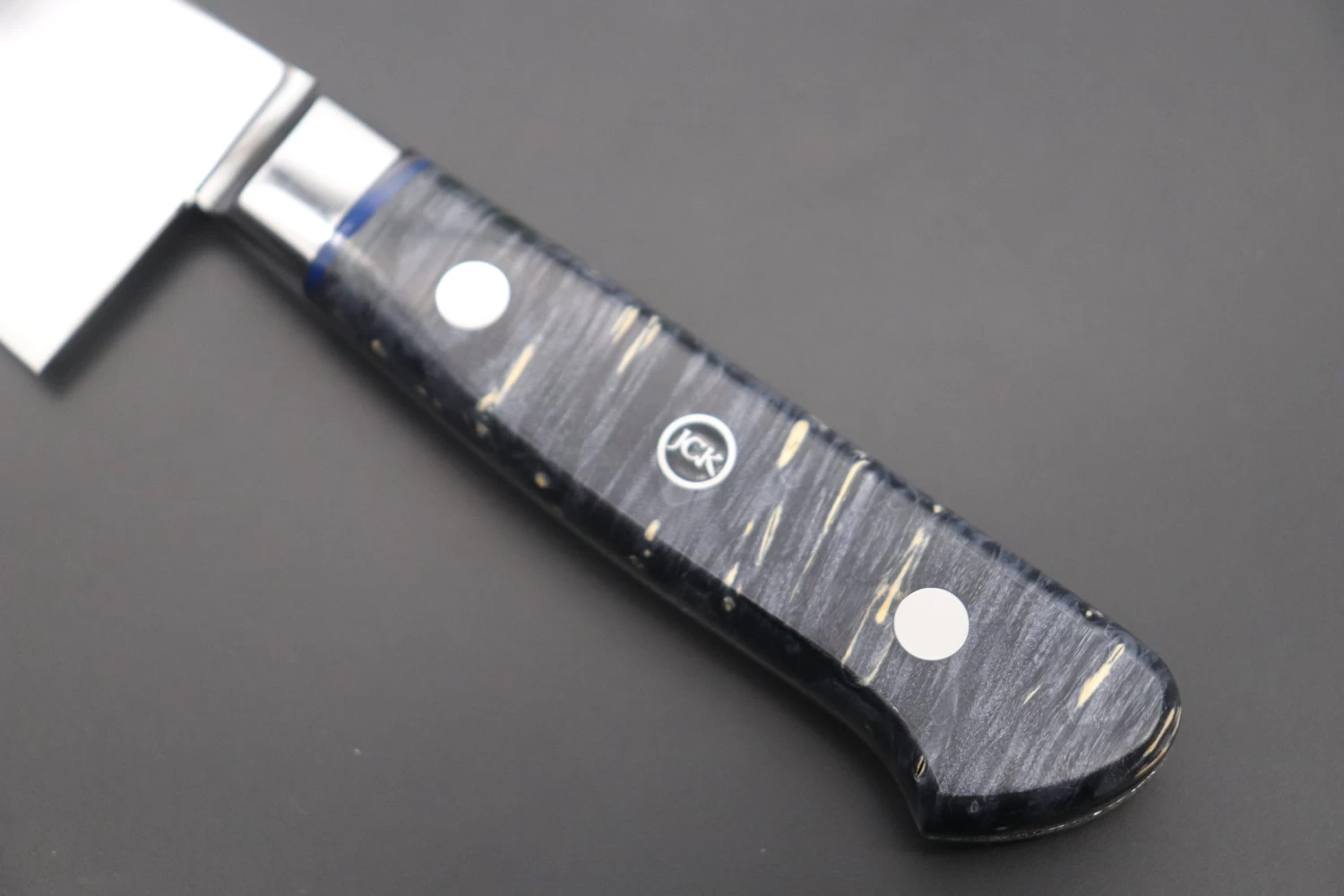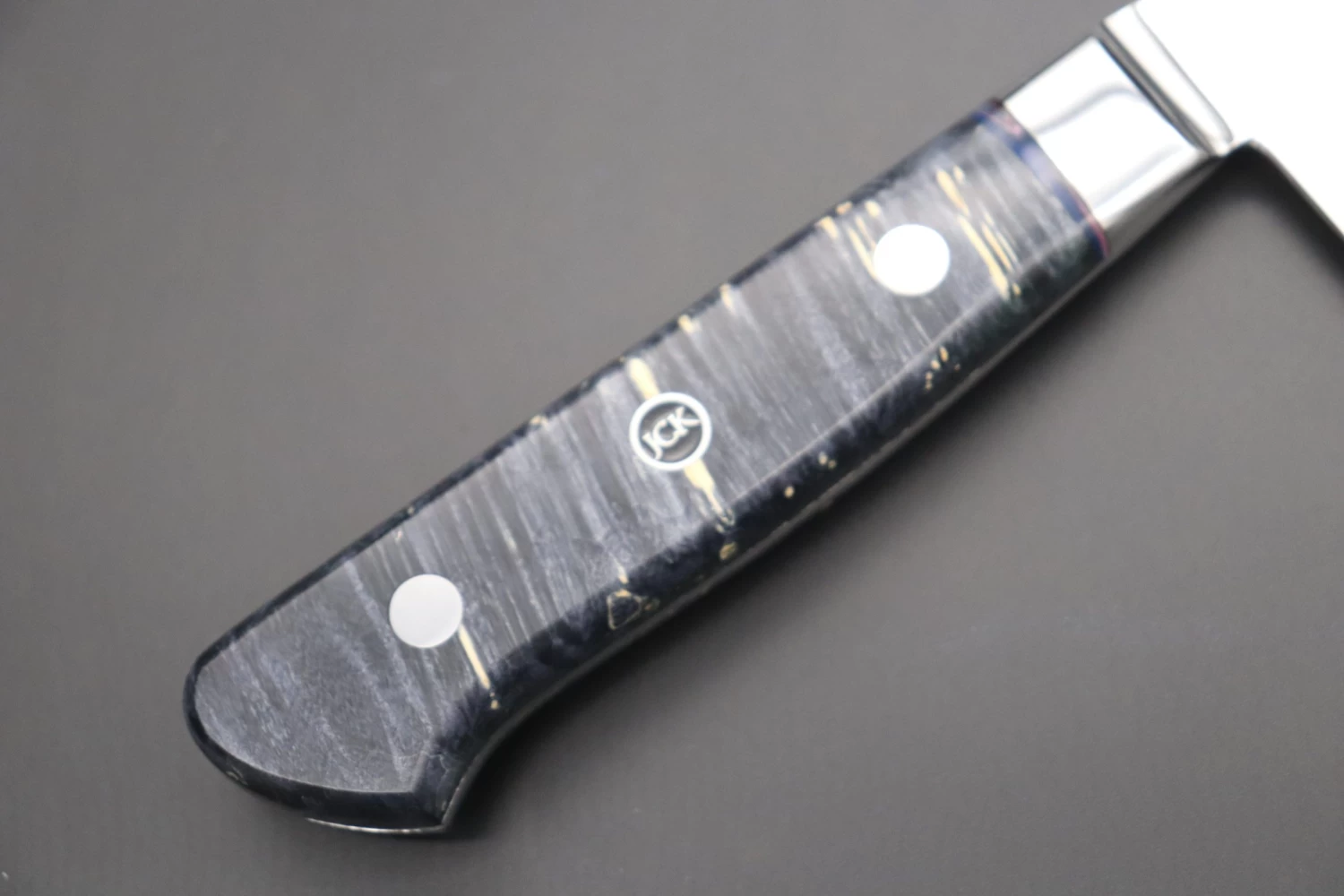 The knives feature full tang construction, premium handle scales, a perfectly mirror polished stainless steel bolster and a Handmade “JCK” Mosaic Pin that adds a stylish design accent. The bolster and blade tang are beautifully mirror polished to match the magnificent blade, and the forged stainless steel bolster provides increased durability and improved blade balance.