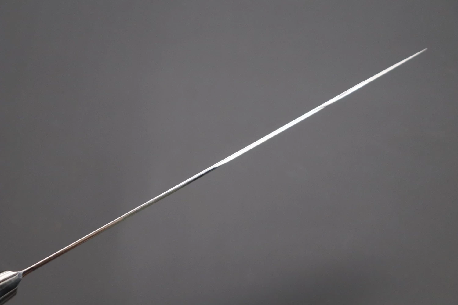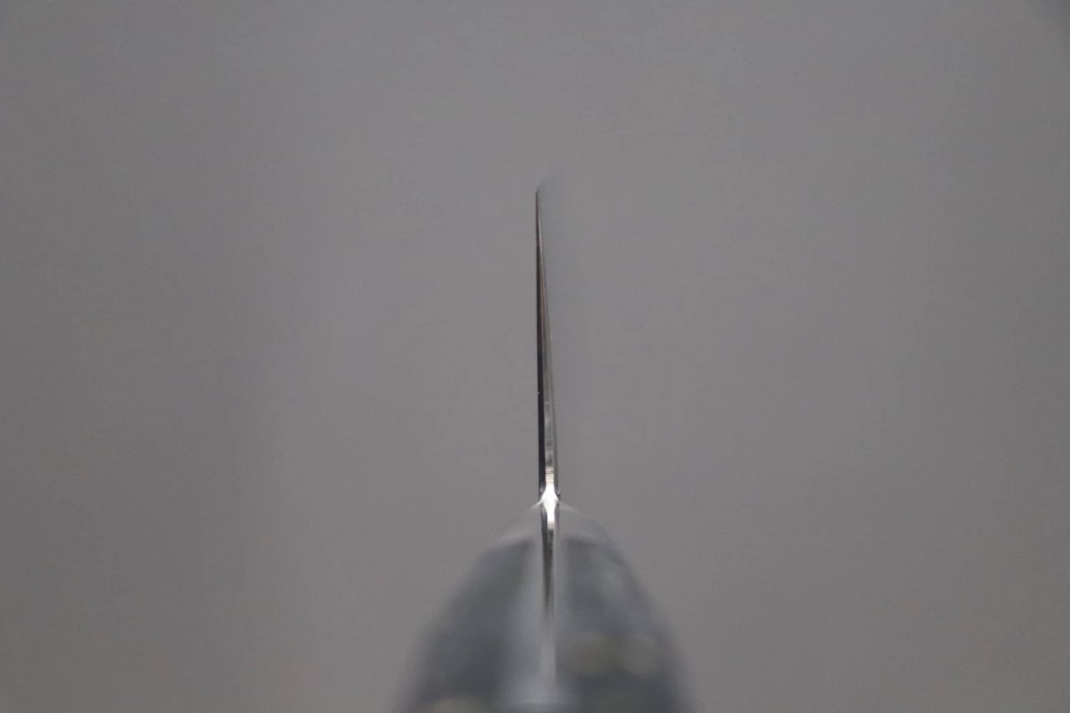 The Kirisuke-Gyuto has a very similar blade profile to the ‘regular’ Gyuto, but it has what is commonly known as a ‘reverse tanto’ tip, or ‘clipped point’, which is very useful for precision cutting. Apart from this difference, the Kirisuke-Gyuto functions in the same way as the ‘plain’ Gyuto knife.