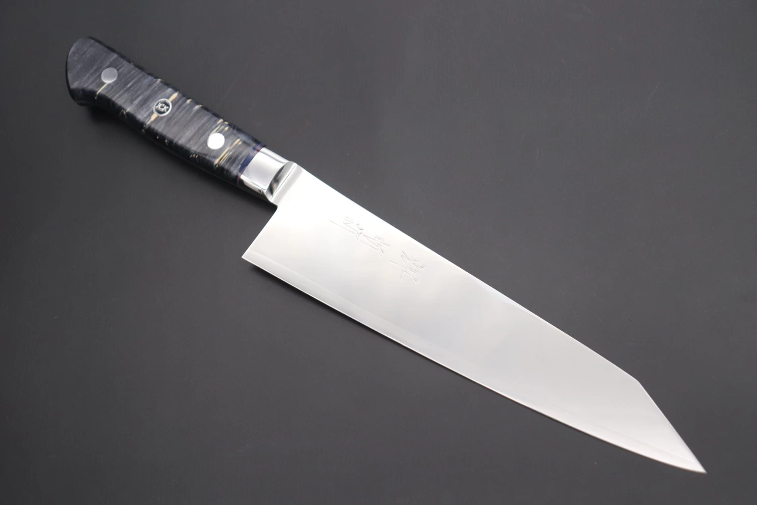 KAGAYAKI NOVEL- Limited Edition Custom R-2 SUNSHINE Series KNLTD-117 Kiritsuke-Gyuto 200mm knife come with a Beautiful Custom Handcrafted Stabilized Dark Grey Color Maple Hybrid Wood Handle that is carefully hand contoured and polished to ensure both a beautiful appearance and a comfortable, secure grip.