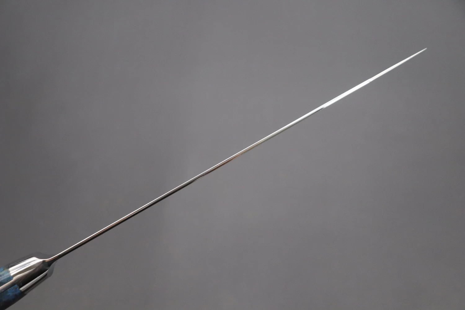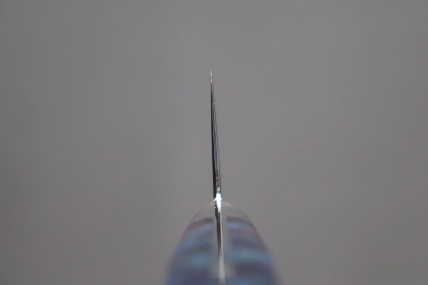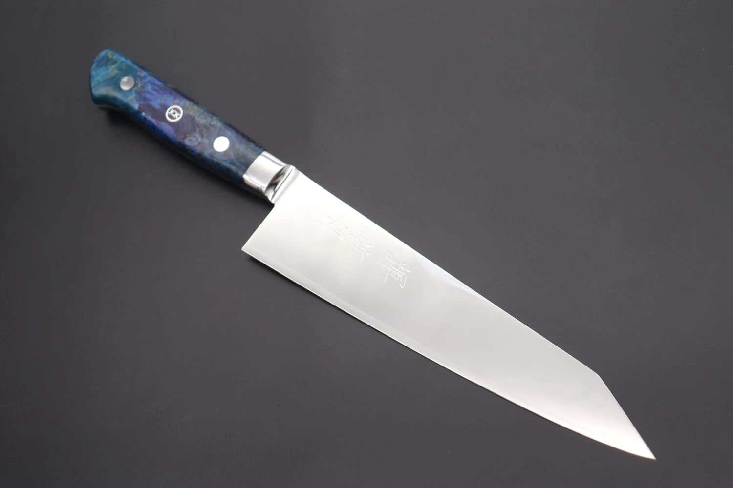 KAGAYAKI NOVEL- Limited Edition Custom R-2 SUNSHINE Series KNLTD-120 Kiritsuke-Gyuto 200mm knife come with a Beautiful Custom Handcrafted Stabilized Ocean Blue Color Maple Hybrid Wood Handle that is carefully hand contoured and polished to ensure both a beautiful appearance and a comfortable, secure grip.