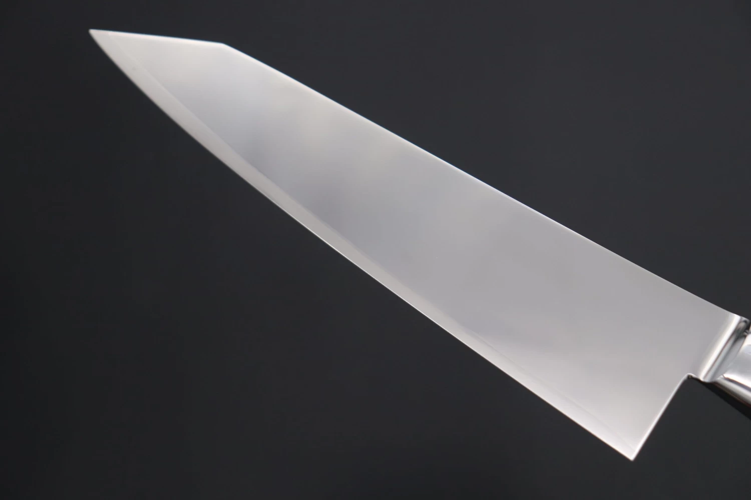 The Kirisuke-Gyuto has a very similar blade profile to the ‘regular’ Gyuto, but it has what is commonly known as a ‘reverse tanto’ tip, or ‘clipped point’, which is very useful for precision cutting. Apart from this difference, the Kirisuke-Gyuto functions in the same way as the ‘plain’ Gyuto knife.