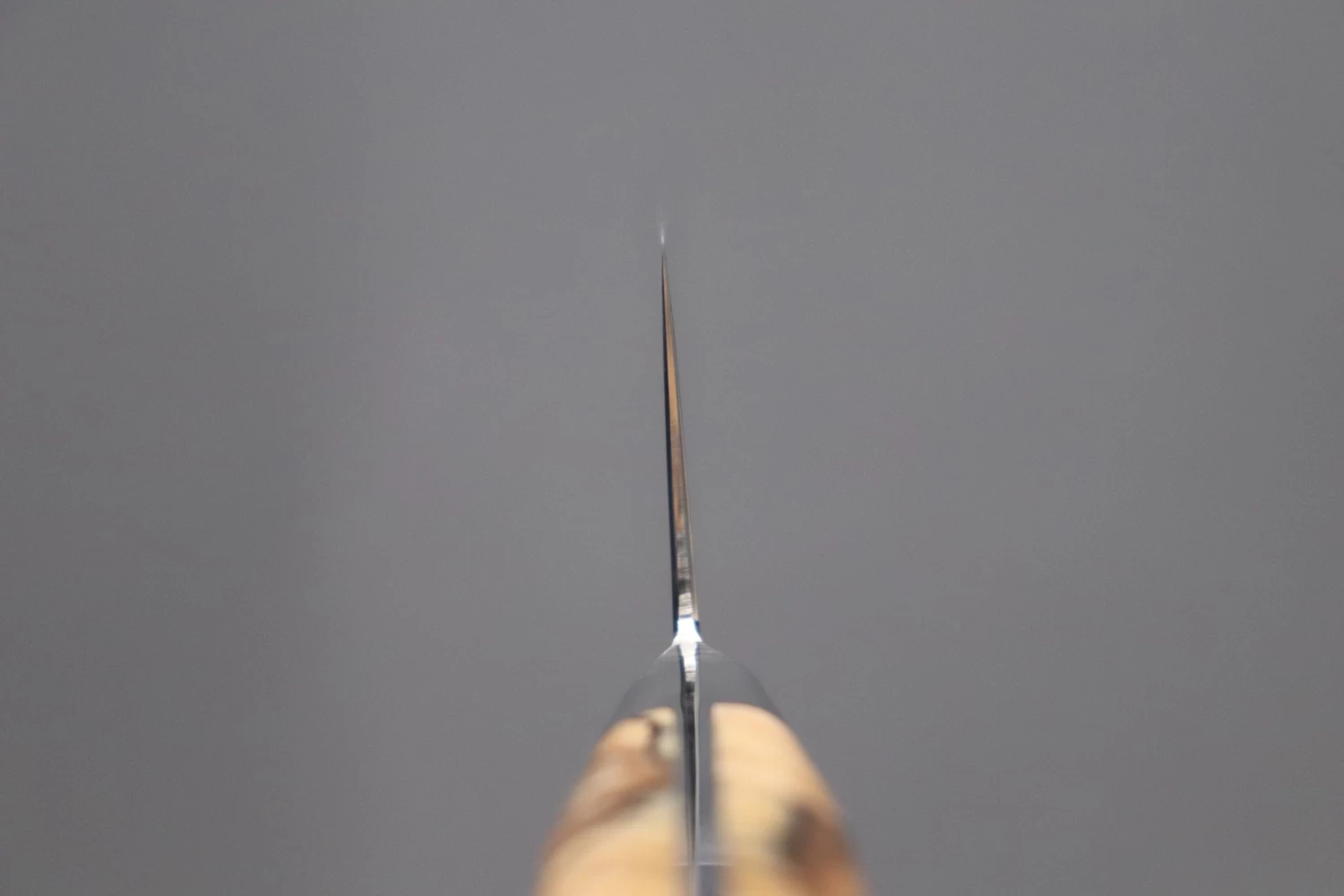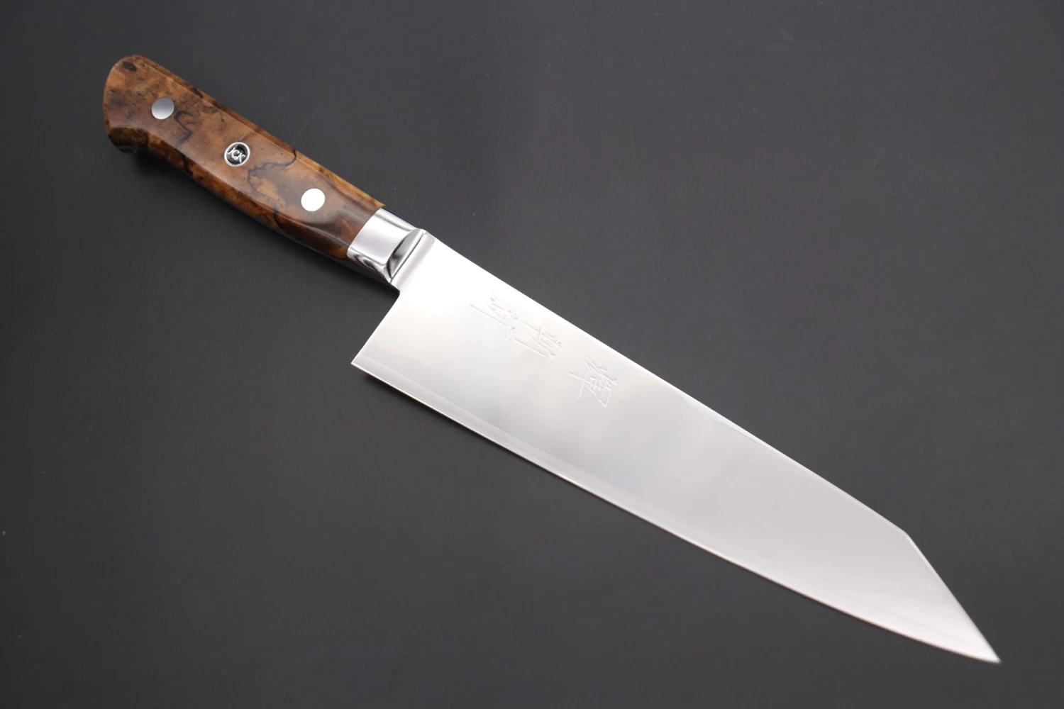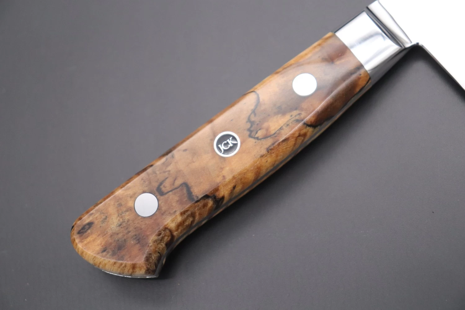 KAGAYAKI NOVEL- Limited Edition Custom R-2 SUNSHINE Series KNLTD-121 Kiritsuke-Gyuto 200mm knife come with a Beautiful Custom Handcrafted Stabilized Spalted Wood Handle that is carefully hand contoured and polished to ensure both a beautiful appearance and a comfortable, secure grip.
