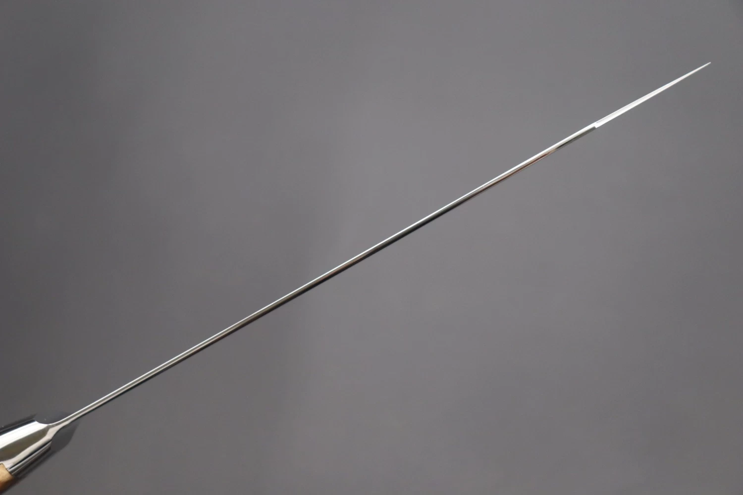 In order to satisfy new market demands, including those of a large number of experienced users and knife enthusiasts, Master Gotou has been refining his techniques for making a new generation of special steel knives. Master Gotou selected a special Powdered Metallurgy High Speed Tool Steel called “R-2”, which he heat treats to HRc. 63. R-2 is produced by a highly reputable Japanese company called Kobelco and offers remarkable cutting performance and edge retention. The blades have a 3-layer construction, with outer layers of soft stainless steel that support the hard R-2 steel core, providing improved blade strength and allowing easy maintenance.