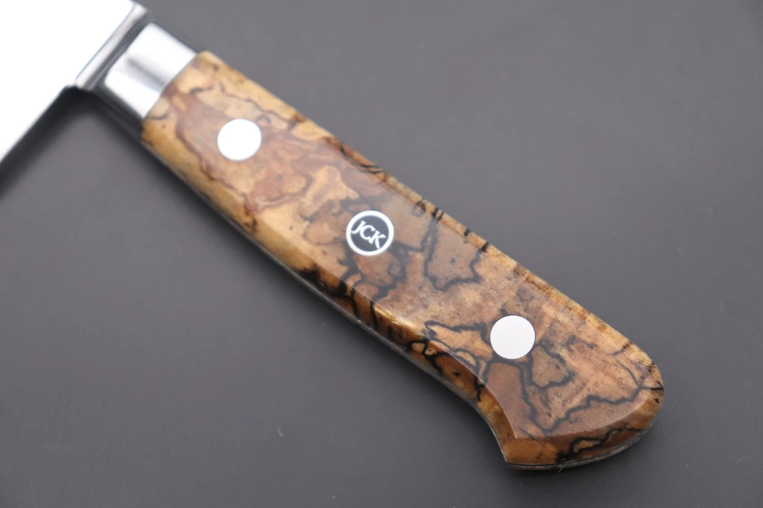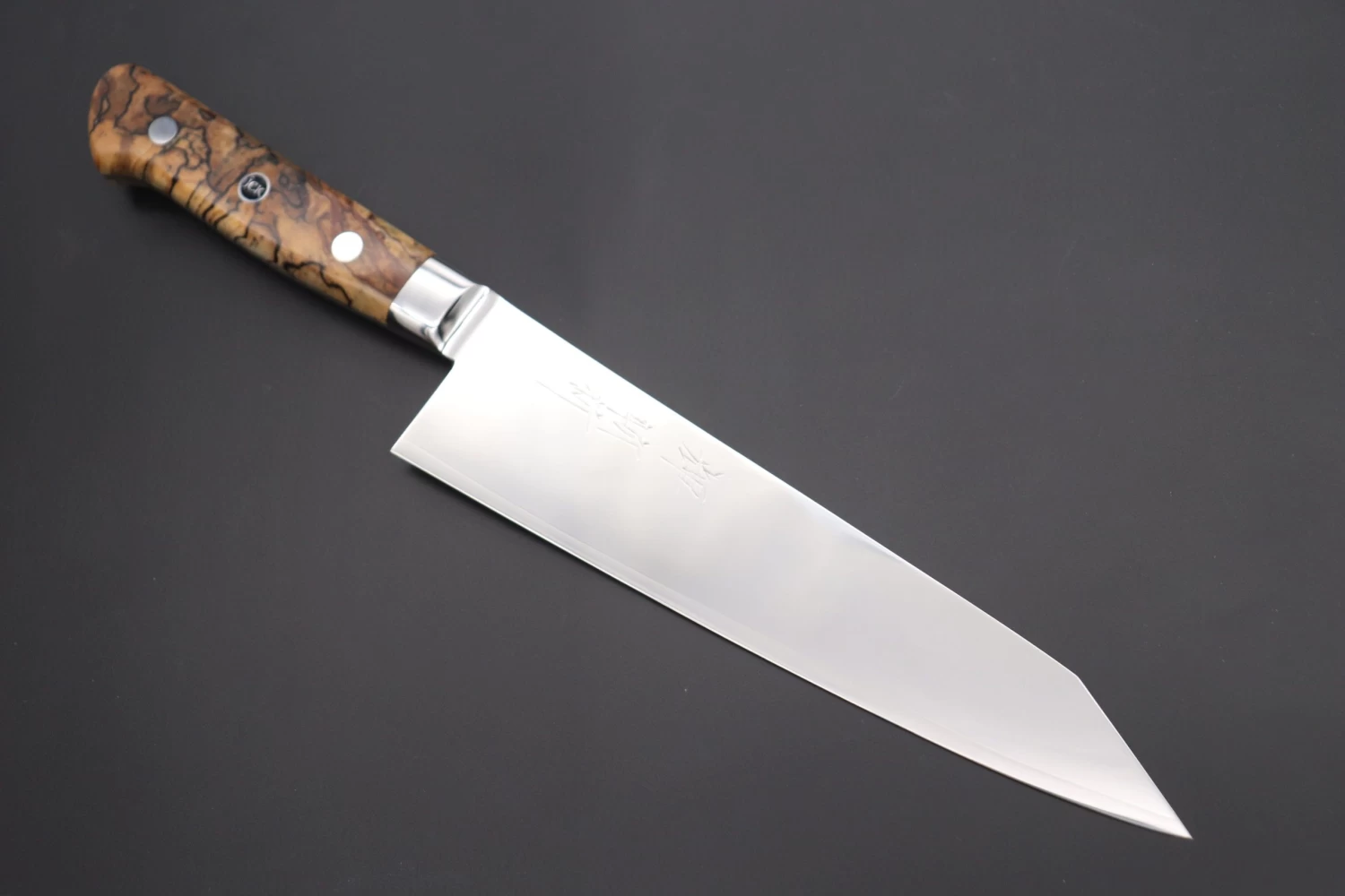 KAGAYAKI NOVEL- Limited Edition Custom R-2 SUNSHINE Series KNLTD-123 Kiritsuke-Gyuto 200mm knife come with a Beautiful Custom Handcrafted Stabilized Spalted Wood Handle that is carefully hand contoured and polished to ensure both a beautiful appearance and a comfortable, secure grip.