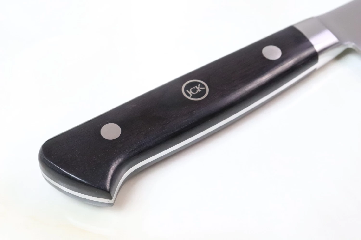 The knives feature full tang construction, water-resistant black pakkawood (Resin impregnated wood composite) handle scales and a “JCK” Handmade Mosaic Pin that adds a stylish design accent. The forged stainless steel bolsters increase durability and improve blade balance.