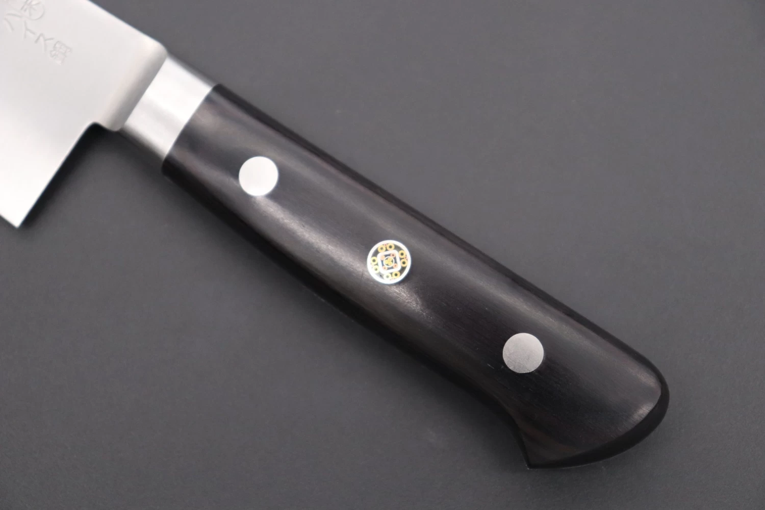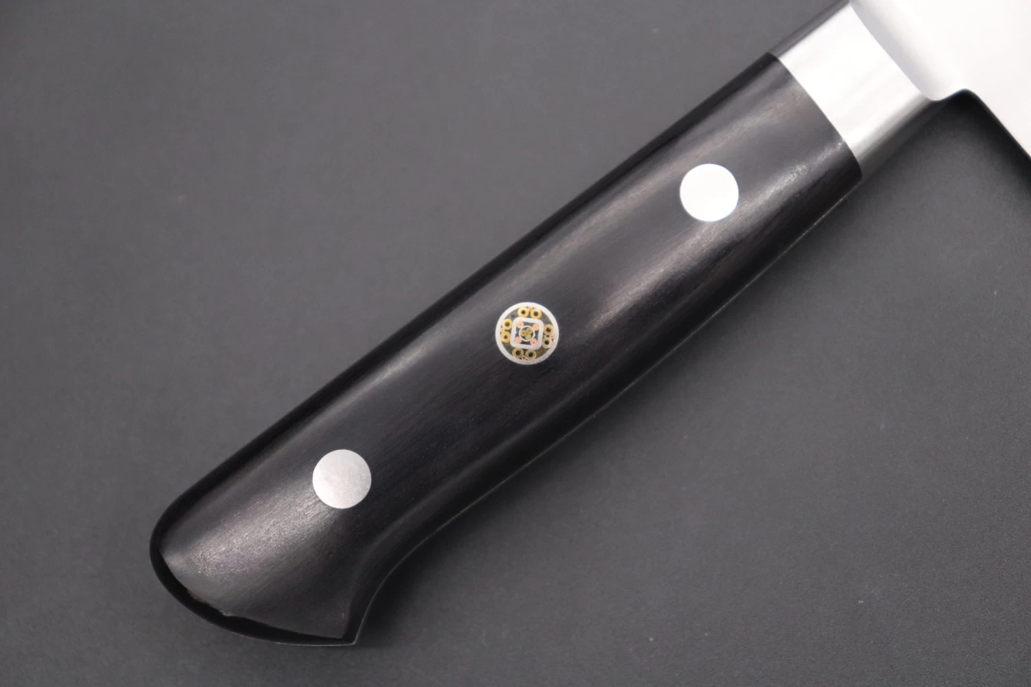 In order to satisfy new market demands, including those of a large number of experienced users and knife enthusiasts, Master Gotou has recently been refining his techniques for making the new generation of special steel knives. Master Gotou selected a special Powdered Metallurgy High Speed Tool Steel called “R-2”, which he heat-treats to HRc. 63. R-2 is made by a highly reputable Japanese company called Kobelco, and the steel offers remarkable cutting performance and edge retention. It is 3 layers construction blade, outer soft stainless steel supports the R-2 hard steel core for making the strength and ease of the maintenance.