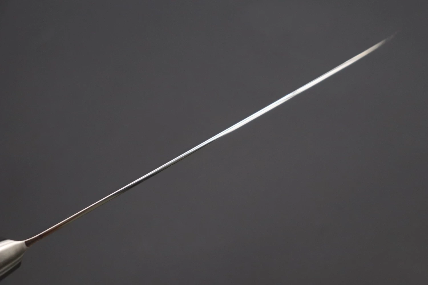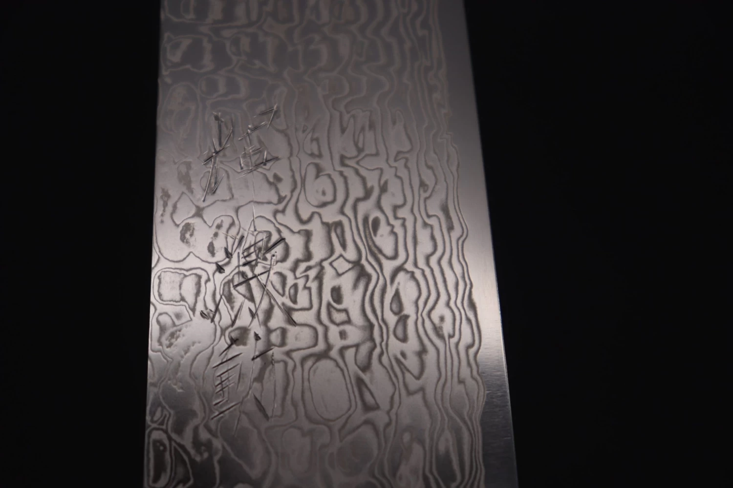 For the core steel of this Damascus knife, Master Craftsman Mr. Gotou selected a special Powdered Metallurgy High Speed Tool Steel called “R-2”, which he heat-treats to HRc. 63. R-2 is made by a highly reputable Japanese company called Kobelco, and the steel offers remarkable cutting performance and edge retention. The two outer layers of the blade are made from a unique and elegantly patterned Damascus steel, which is comprised of alternating layers of white-colored nickel steel and sparkling mirror polished layers of steel.