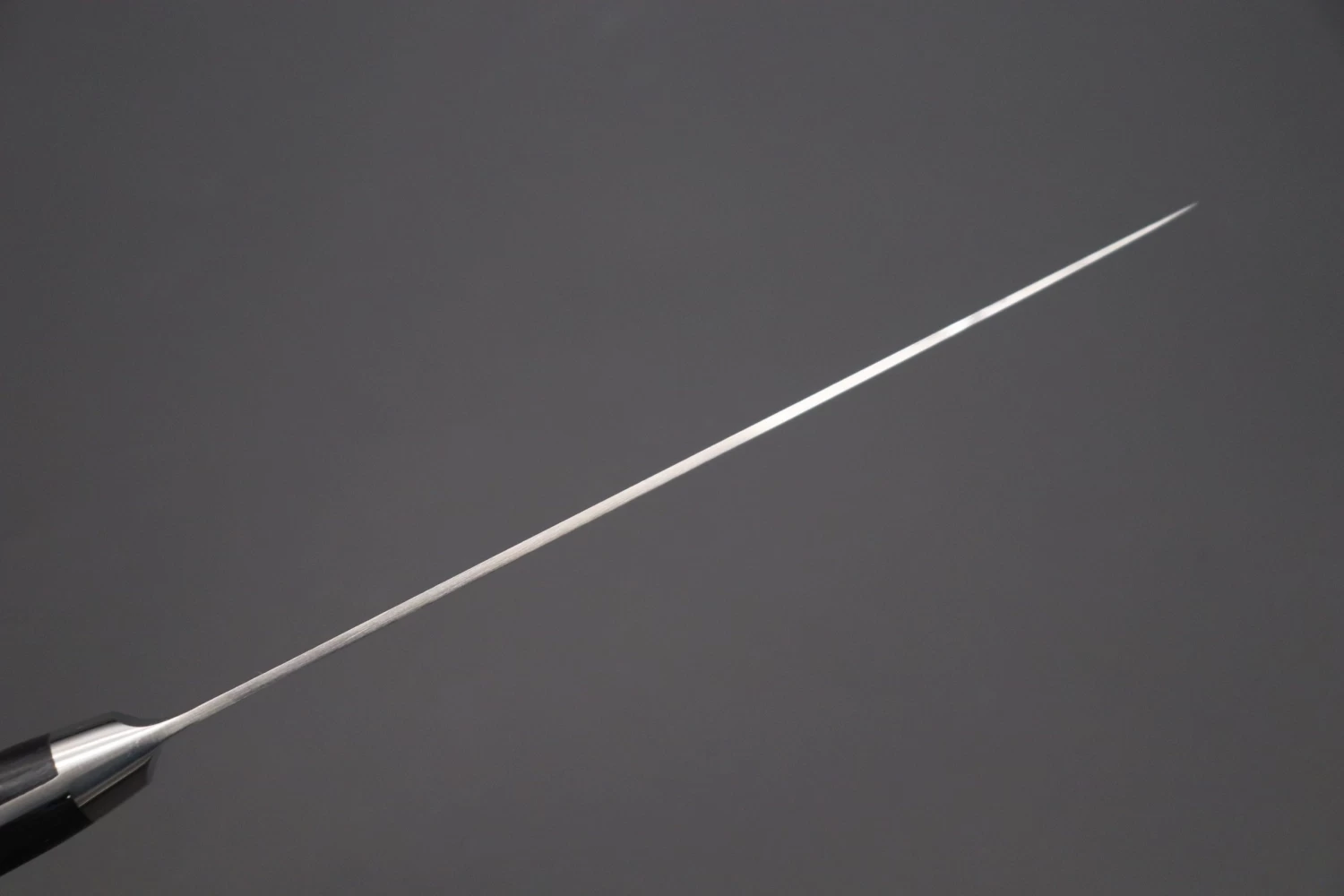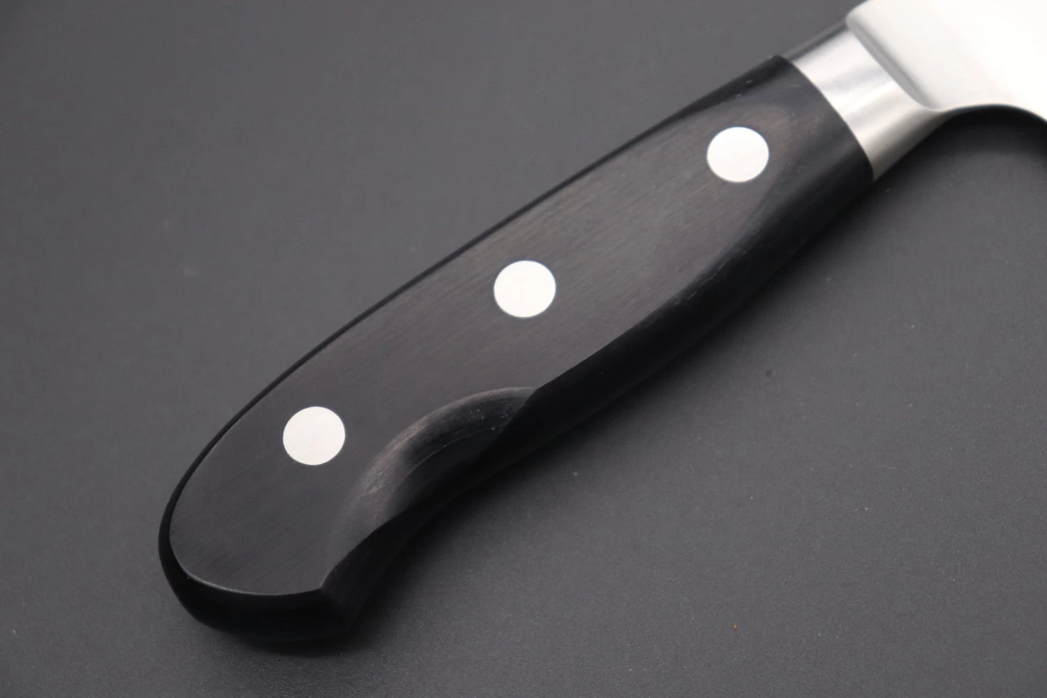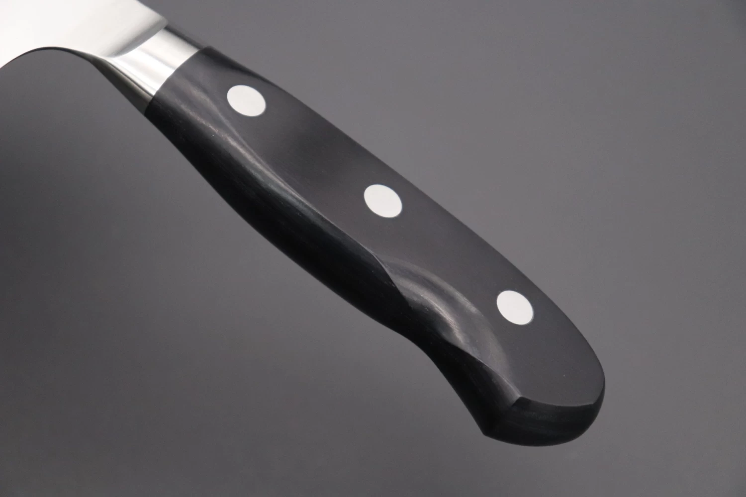 The secret behind the outstanding cutting performance of Kanetsugu knives is their custom-designed convex blade profile and their thin cutting edges, which are suitable for fine cutting tasks. The AUS-8 Molybdenum Vanadium stainless steel blades of the Pro M series are corrosion-resistant, tough, strong and easy of re-sharpen. These characteristics make them very suitable for first-time users of Japanese knives, but cost-conscious professionals will also appreciate them. Their handles are made from black-colored pakkawood, which is water-resistant, durable and very stable. The rounded handle shape provides a comfortable, secure grip and is well balanced against the weight of the blade.