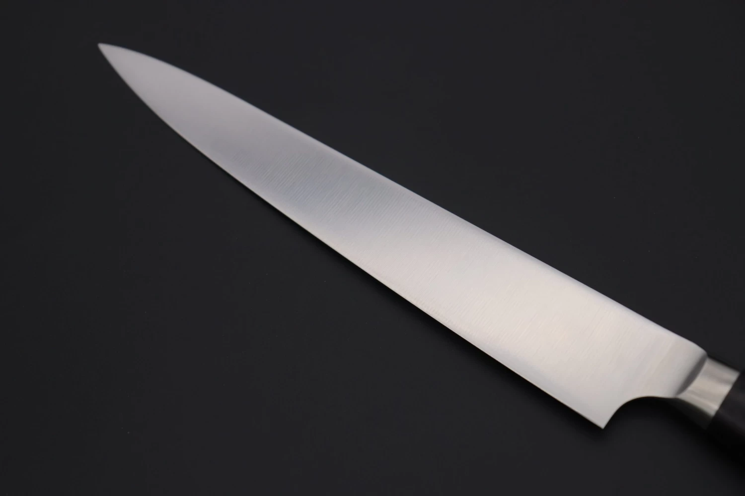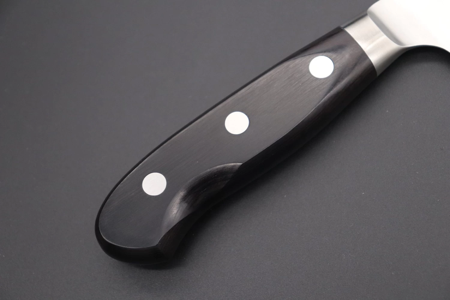 The secret behind the outstanding cutting performance of Kanetsugu knives is their custom-designed convex blade profile and their thin cutting edges, which are suitable for fine cutting tasks. The AUS-8 Molybdenum Vanadium stainless steel blades of the Pro M series are corrosion-resistant, tough, strong and easy of re-sharpen. These characteristics make them very suitable for first-time users of Japanese knives, but cost-conscious professionals will also appreciate them. Their handles are made from black-colored pakkawood, which is water-resistant, durable and very stable. The rounded handle shape provides a comfortable, secure grip and is well balanced against the weight of the blade.