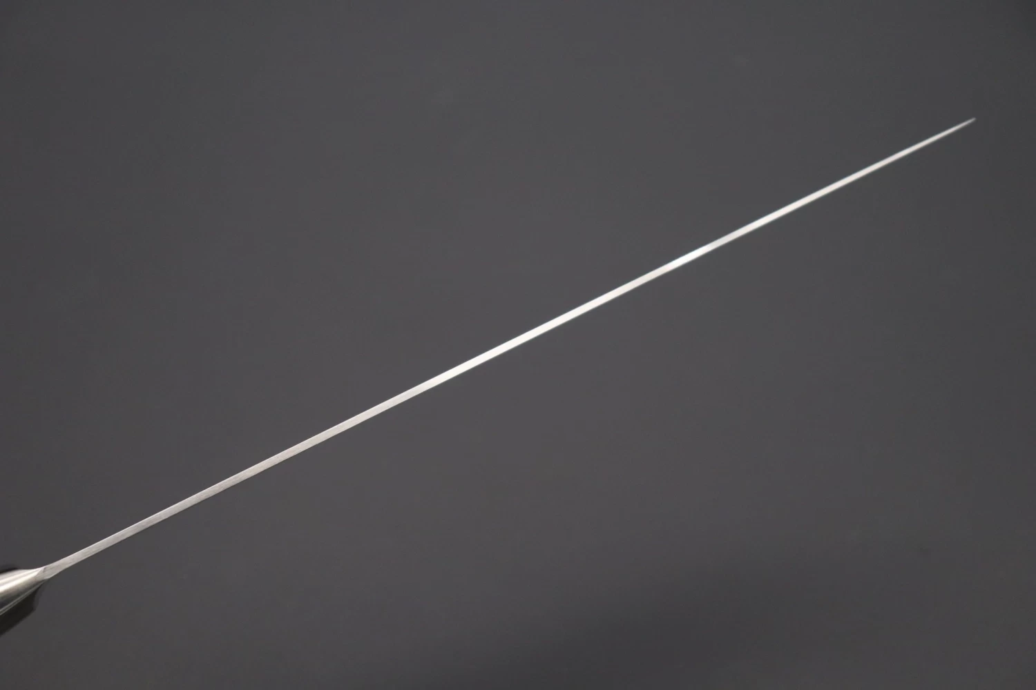 The long, narrow, graceful blade of the Sujihiki is particularly useful for trimming away sinew and fat from meat, finely slicing meat or boneless fish, or for filleting and skinning fish. The long blade allows the meat or fish to be cut in one single drawing motion, from heel to tip.