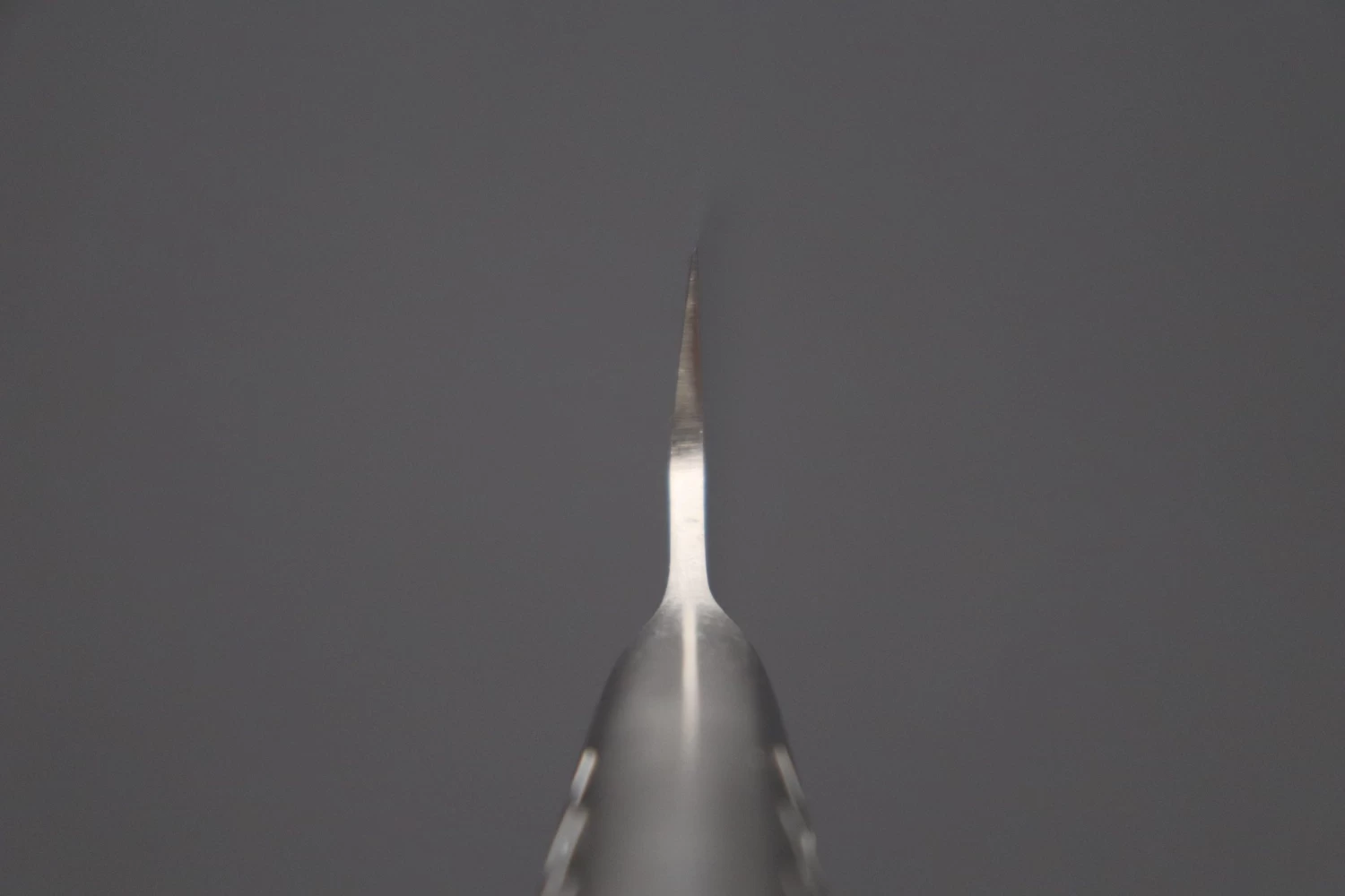 Kanetsugu Pro S knives have Katana Handle motif of hollow 18-8 stainless steel handles seamlessly fitted to their blades. They are very sanitary, non-slip, comfortable, light weight and well balanced. The blades of the Pro S series have a custom-designed convex blade profile that provides outstanding cutting performance and thin cutting edges, which are suitable for fine cutting tasks. The blades are made from AUS-8 Molybdenum Vanadium stainless steel and are corrosion-resistant, tough, strong and easy to re-sharpen. These characteristics make these knives very suitable for first-time users of Japanese knives, but cost-conscious professionals will also appreciate them.
