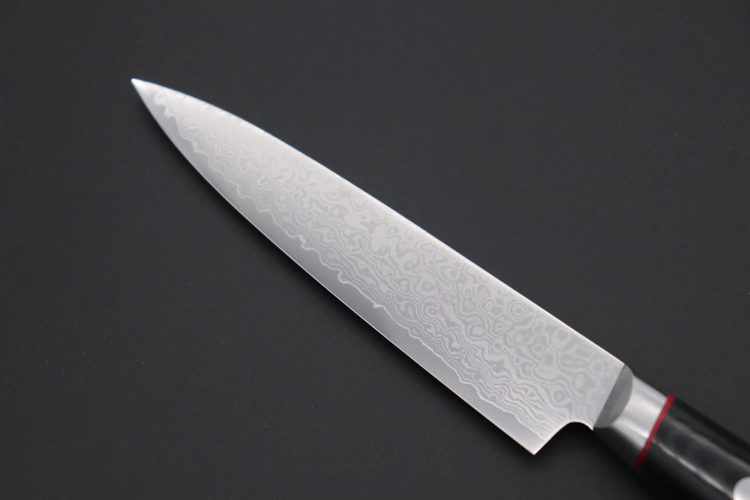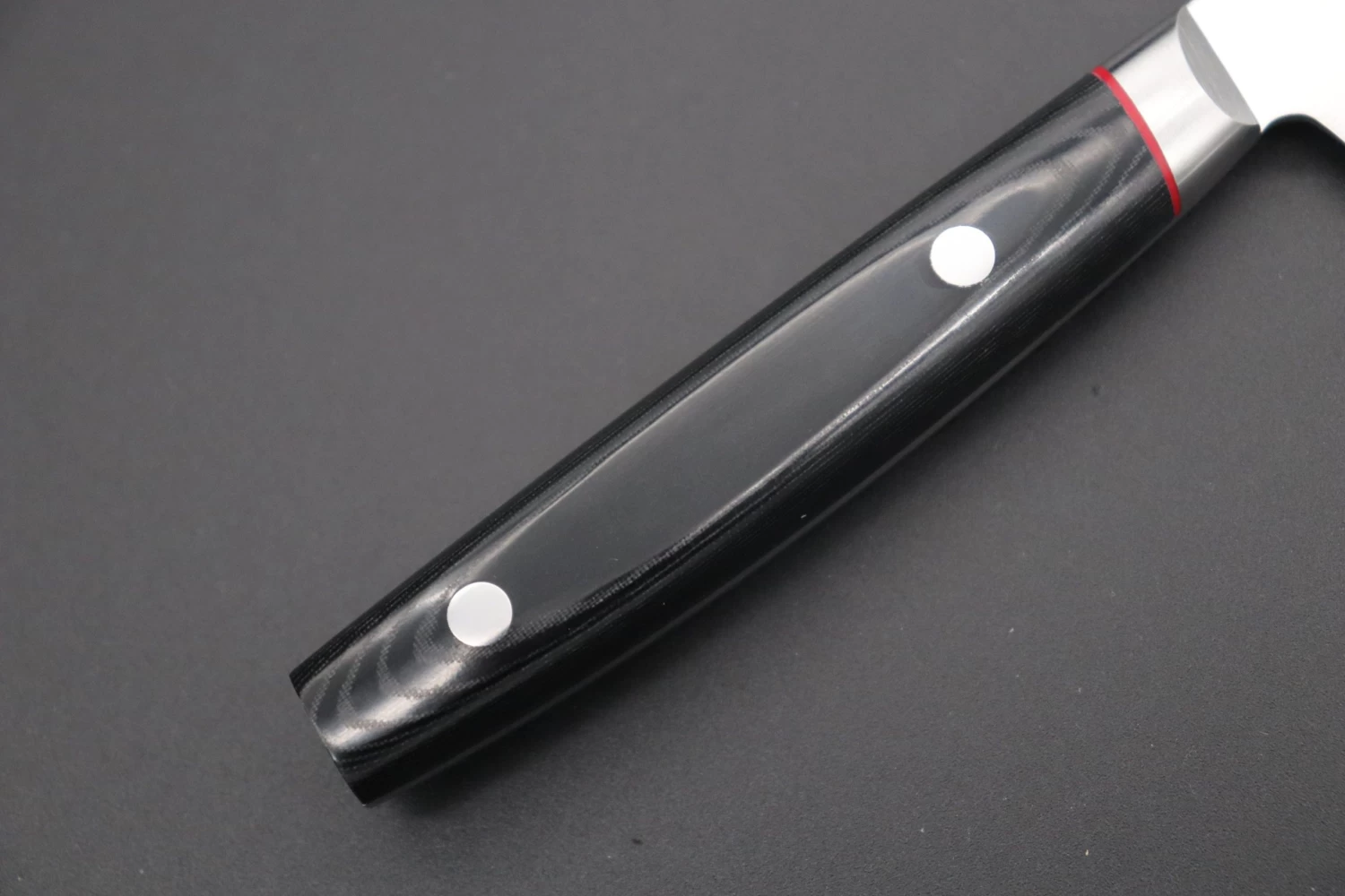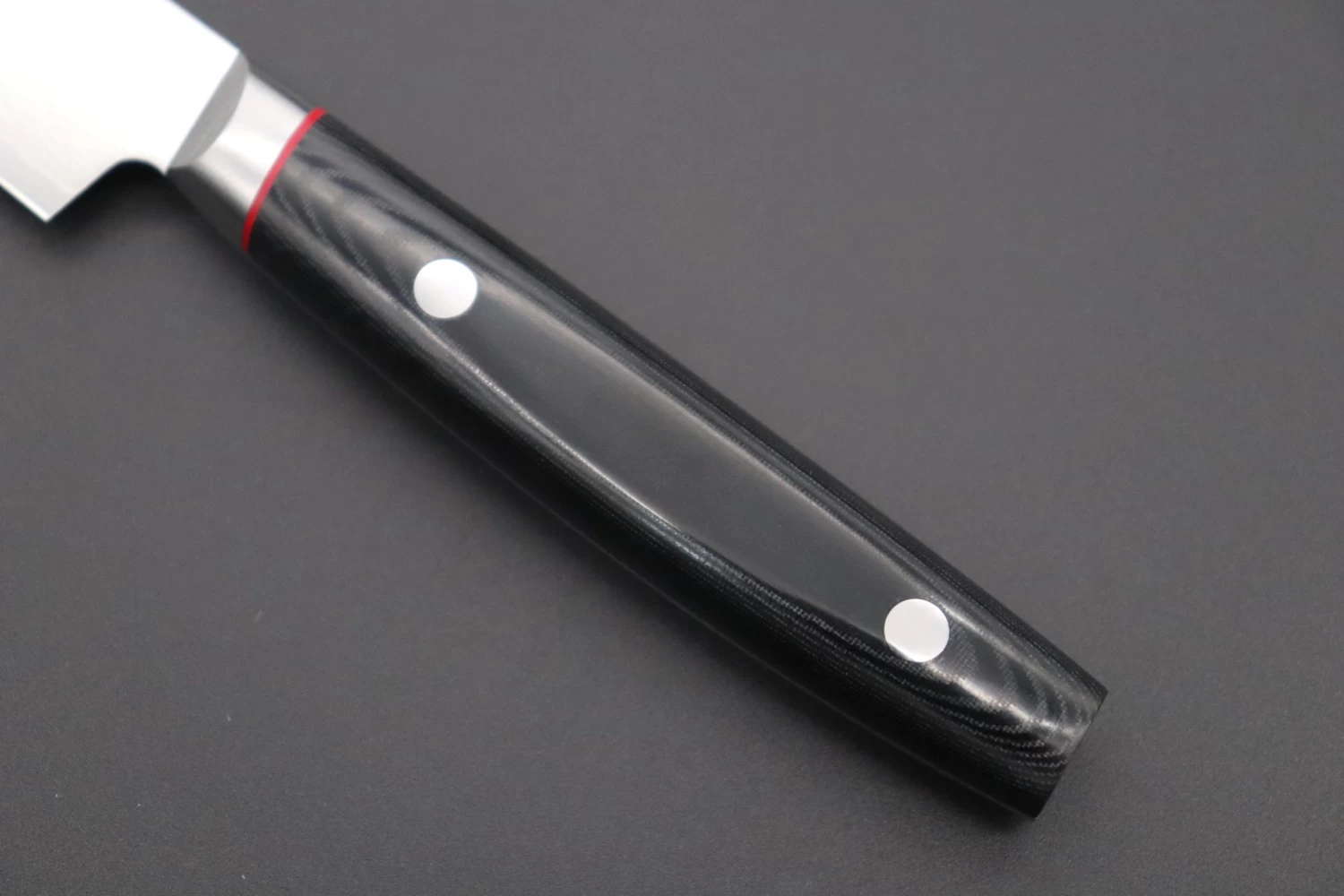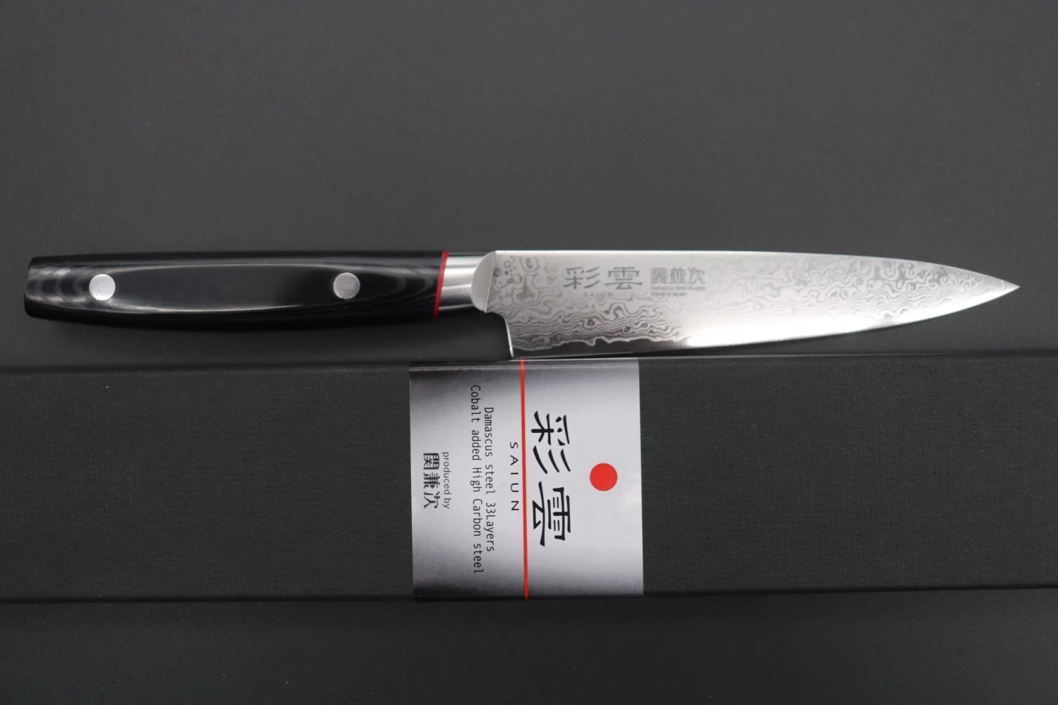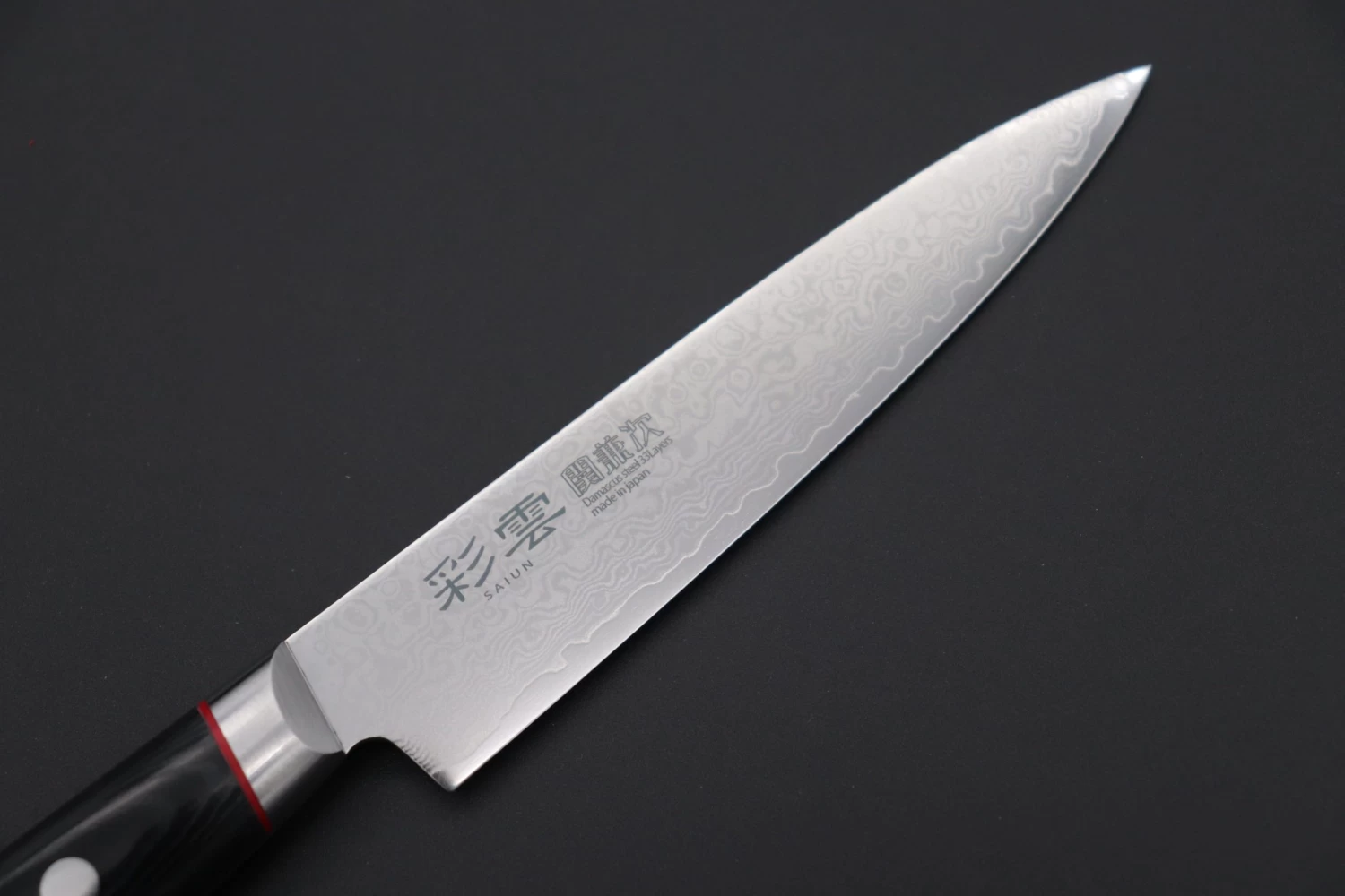 Saiun Damascus knives have a cutting edge of VG-10 stainless steel that is clad with Damascus (Total of 33 layers; HRc. 60-61) and use Kanetsugu’s special convex edge profile to provide outstanding cutting performance and excellent edge retention. A comfortable black linen Micarta handle accentuated the wood-grain pattern of the Damascus and is shrink-proof, very durable and water-resistant. The stainless steel bolster improves the blade balance and durability and looks stylish next to the red fiber spacer. Kanetsugu use all their passion and experience to make certain that these extremely beautiful knives are still exceedingly practical and cut exceptionally well.