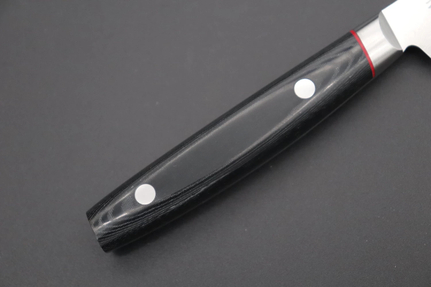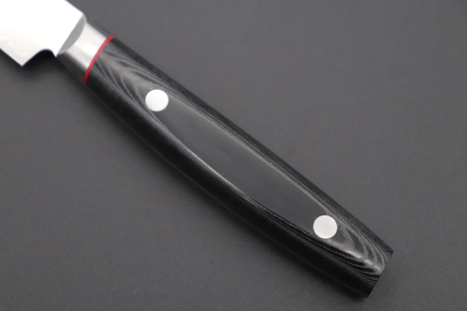 Saiun Damascus knives have a cutting edge of VG-10 stainless steel that is clad with Damascus (Total of 33 layers; HRc. 60-61) and use Kanetsugu’s special convex edge profile to provide outstanding cutting performance and excellent edge retention. A comfortable black linen Micarta handle accentuated the wood-grain pattern of the Damascus and is shrink-proof, very durable and water-resistant. The stainless steel bolster improves the blade balance and durability and looks stylish next to the red fiber spacer. Kanetsugu use all their passion and experience to make certain that these extremely beautiful knives are still exceedingly practical and cut exceptionally well.