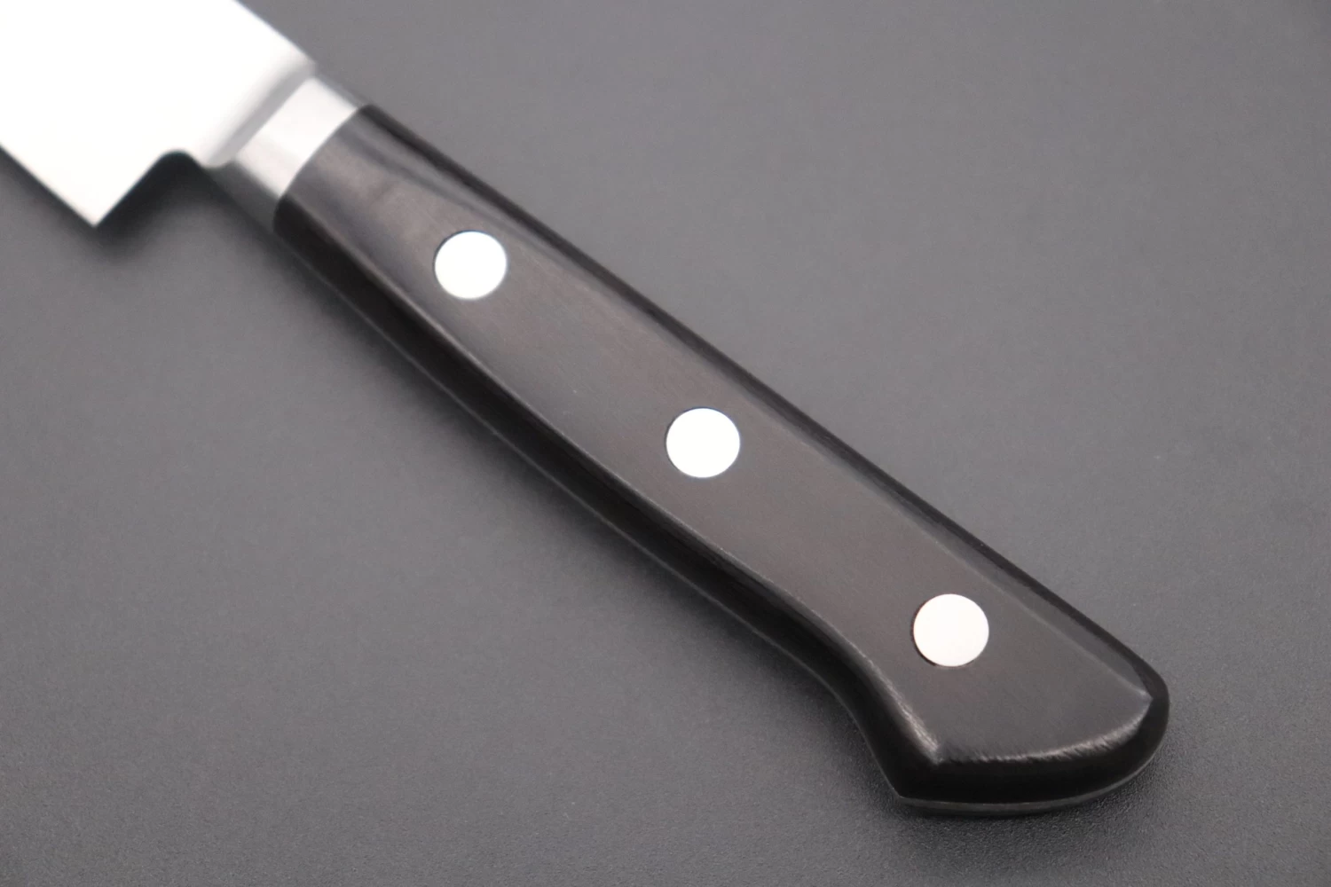 Masamoto CT Series Knife is highly affordable Western-style Chef’s knife that features a high carbon steel blade (HRc. 58-59), full tang construction, attractive red sandalwood handle scales and a seamlessly bolster. The edges of the handle and bolster have been nicely rounded to allow a comfortable, secure grip.