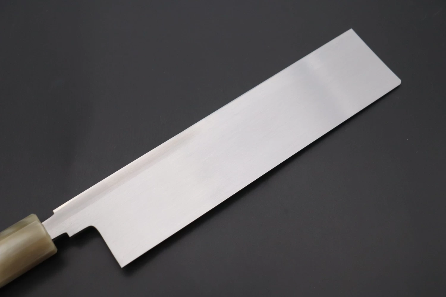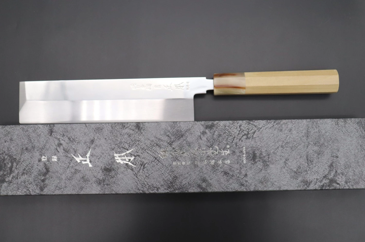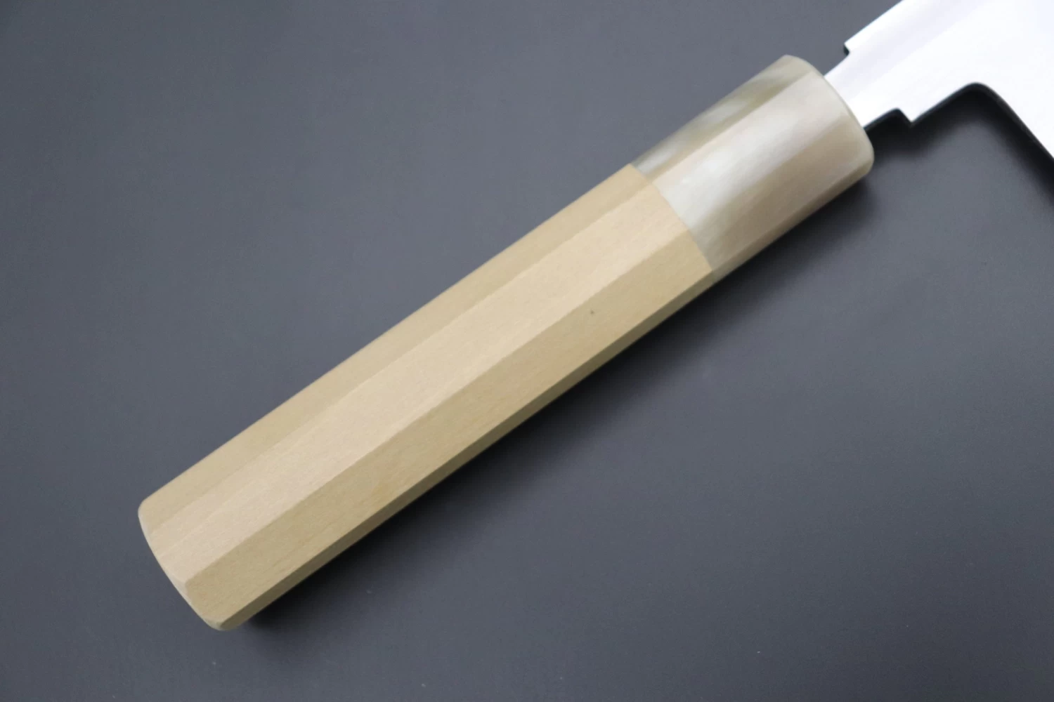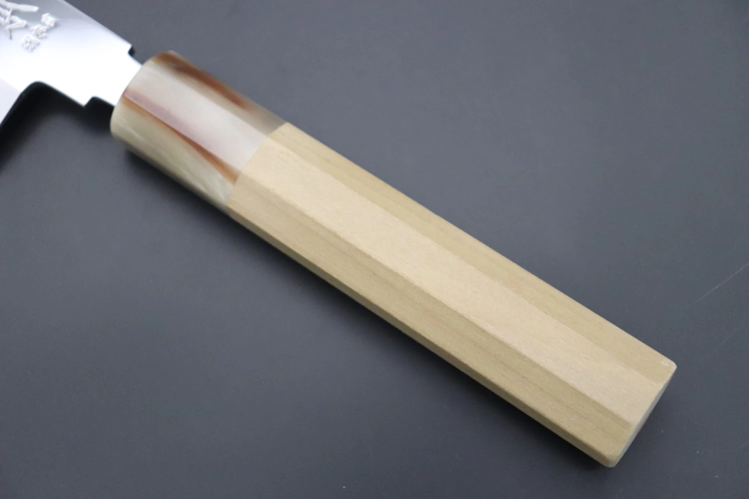Masamoto HA Series knife is fitted with a traditional Japanese octagonal magnolia wood handle with a water buffalo horn ferrule / collar and also includes a matching magnolia wood Saya (Sheath) for safekeeping.