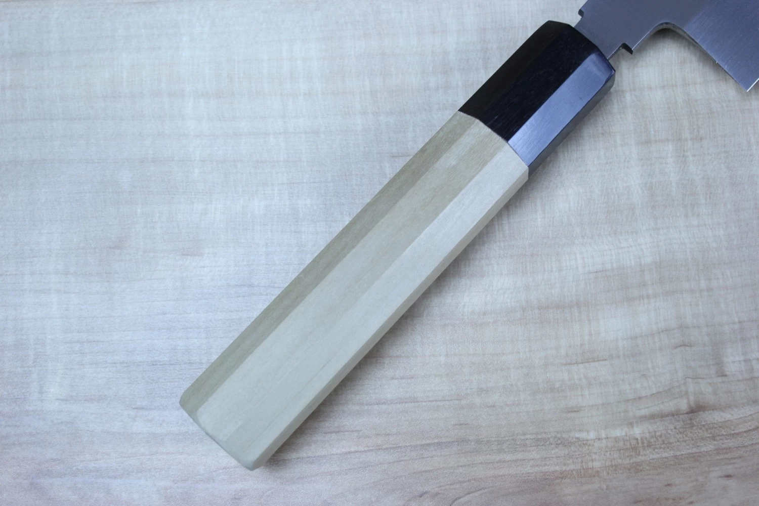 Masamoto HA Series knife is fitted with a traditional Japanese octagonal magnolia wood handle with a water buffalo horn ferrule / collar and also includes a matching magnolia wood Saya (Sheath) for safekeeping.