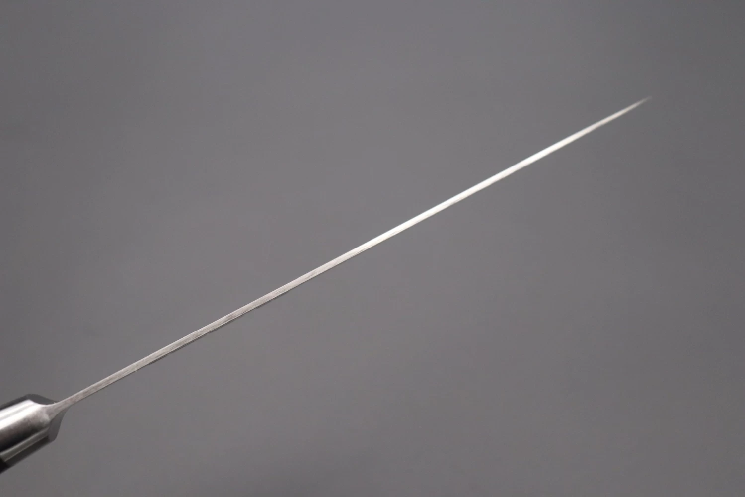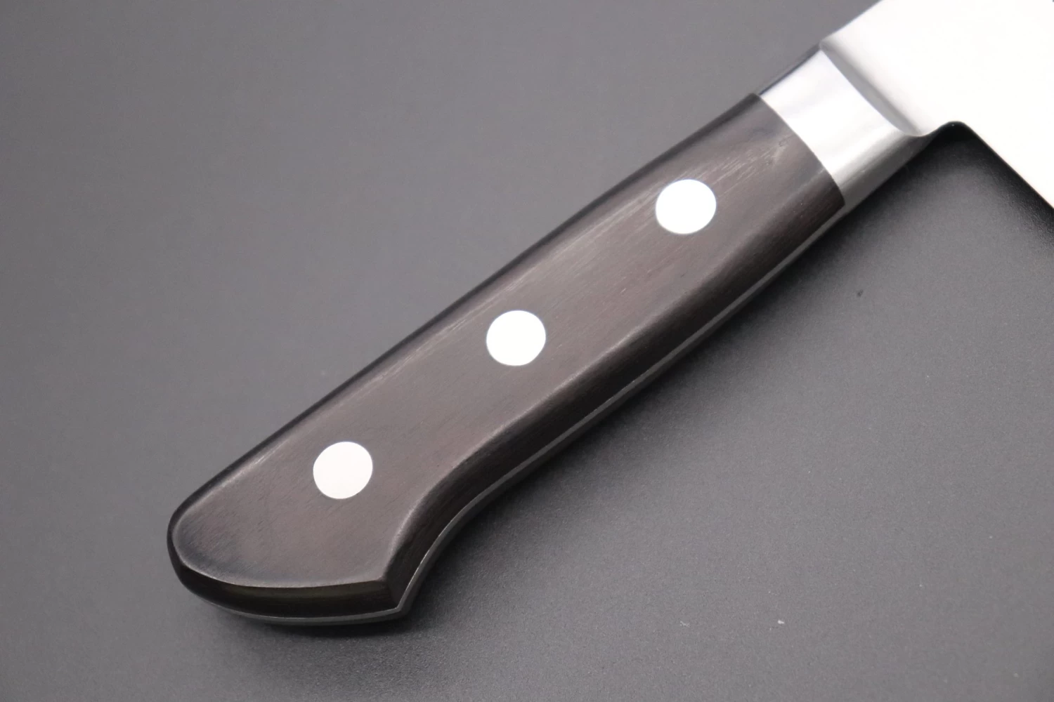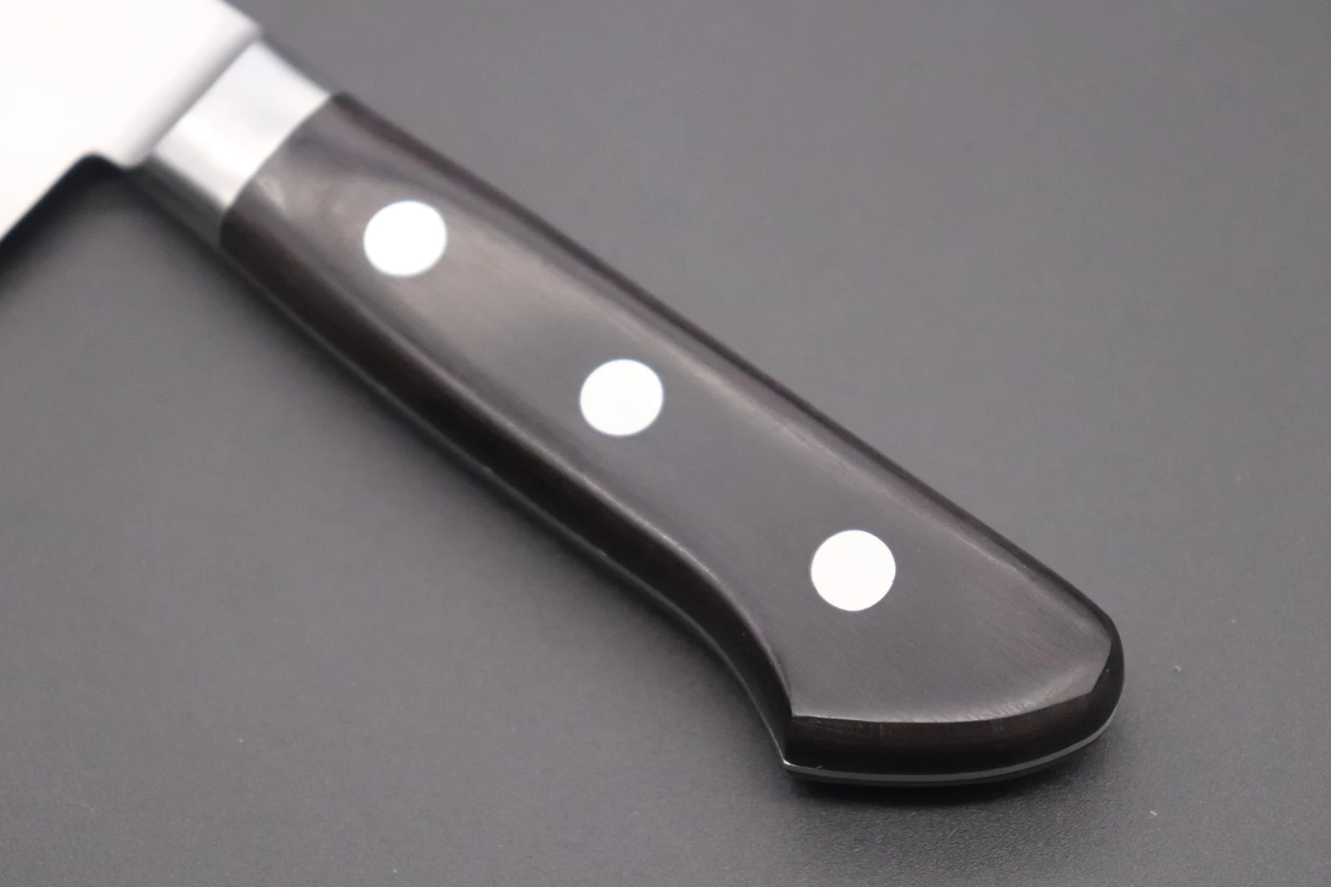 Masamoto HC Series knife features full tang construction, water-resistant black pakkawood (Resin-stabilized wood composite) handle scales and a seamlessly forge-welded stainless steel bolster for extra durability and corrosion-resistance. The handle scales and bolster have also been rounded-off to allow a comfortable, secure grip.