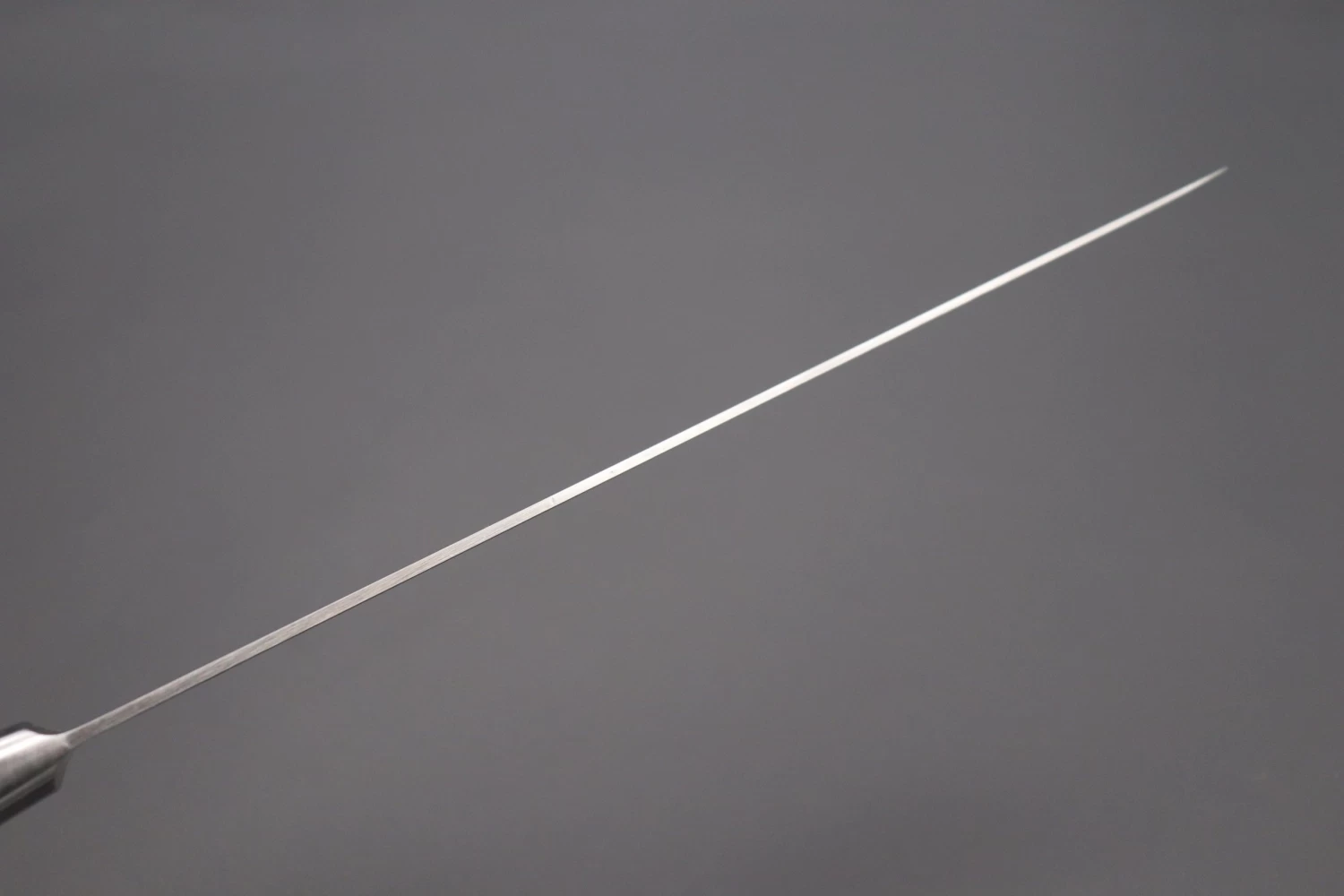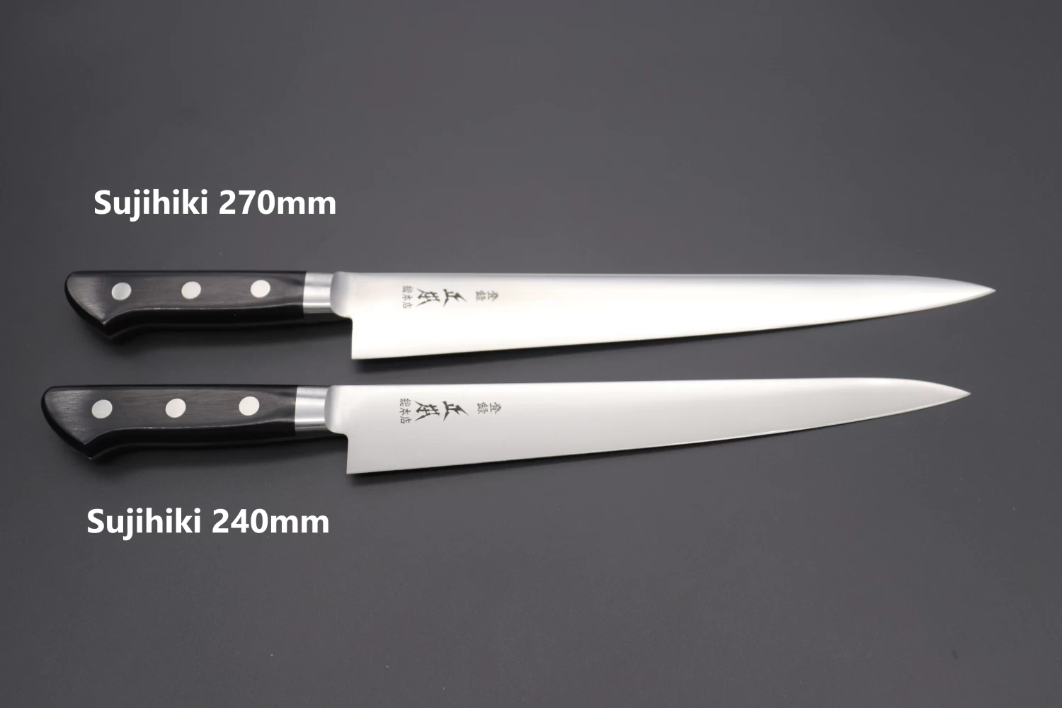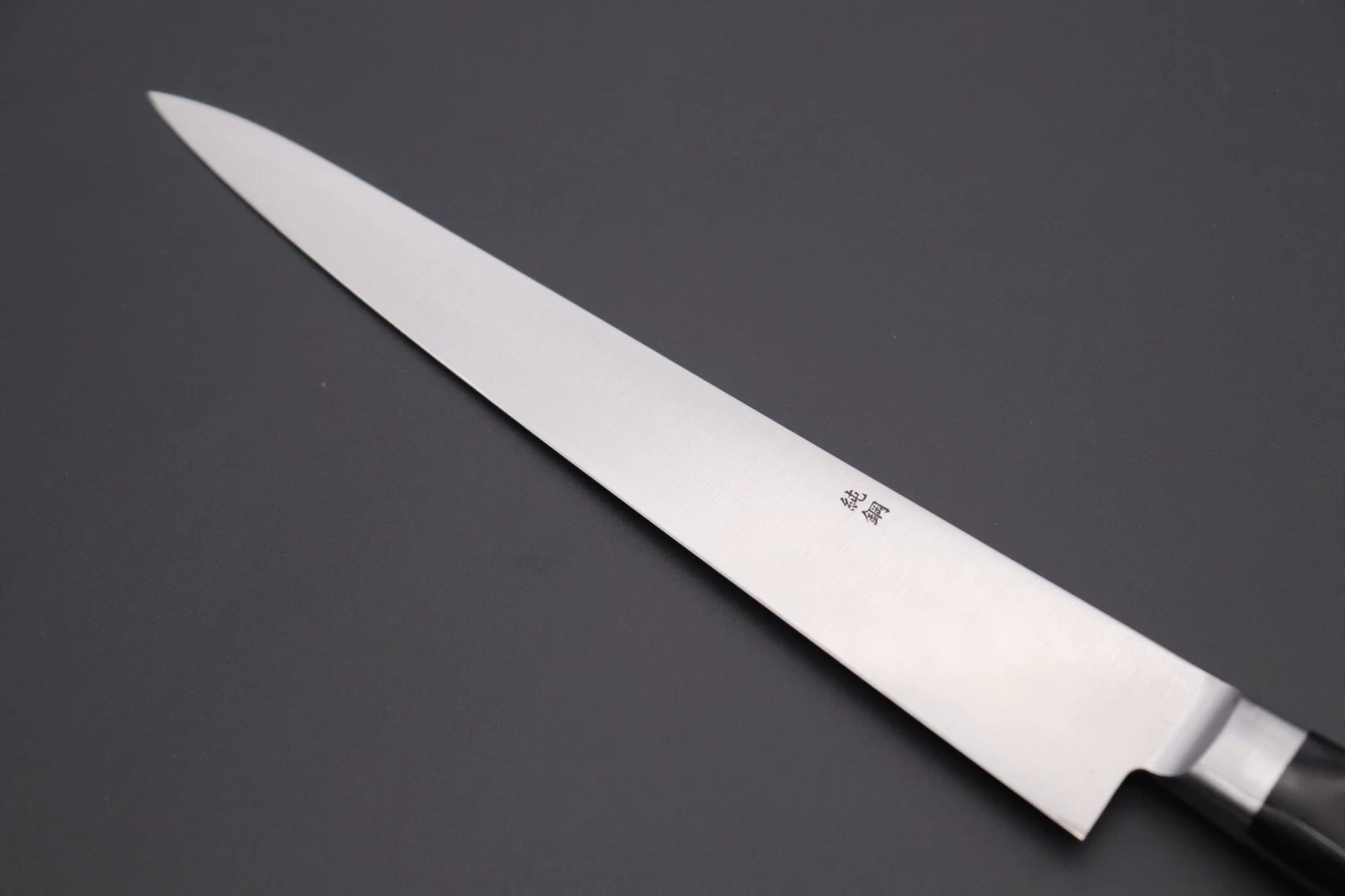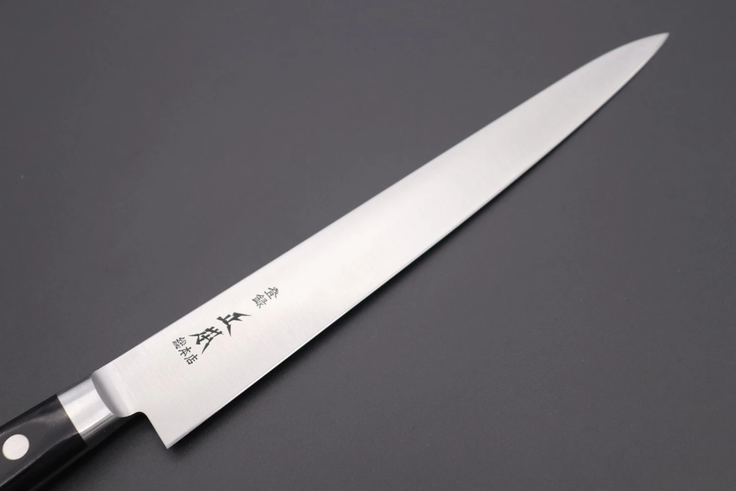 The long, narrow, graceful blade of the Sujihiki is particularly useful for trimming away sinew and fat from meat, finely slicing meat or boneless fish, or for filleting and skinning fish. The long blade allows the meat or fish to be cut in one single drawing motion, from heel to tip.