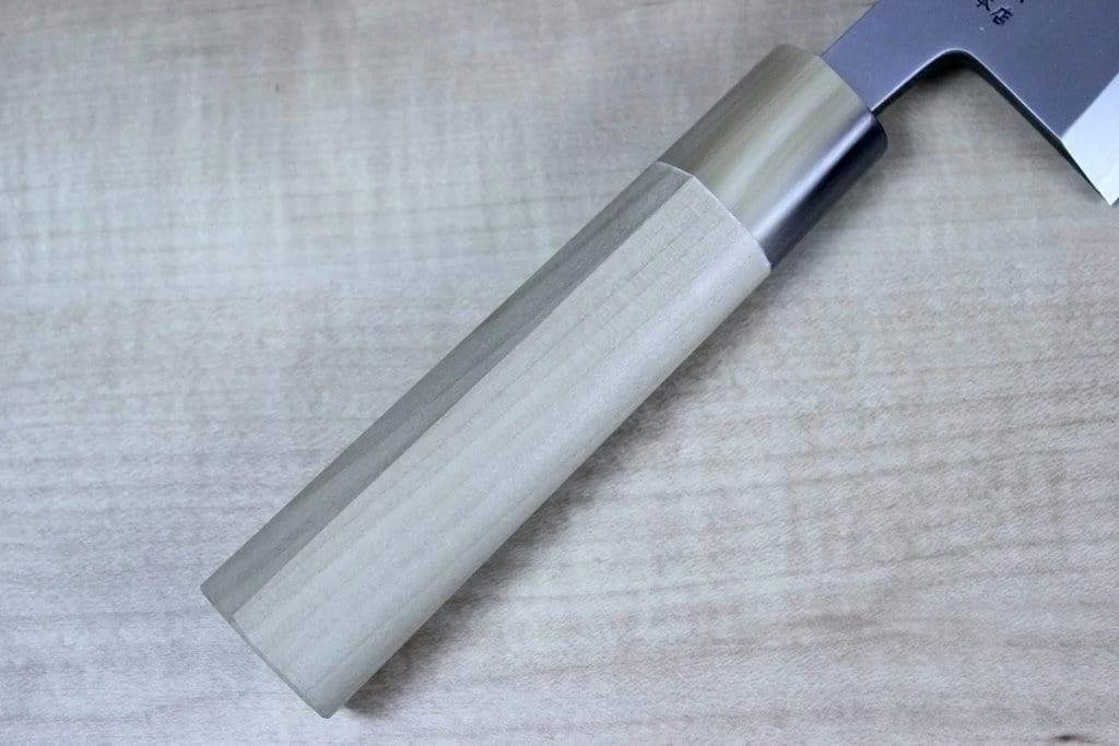 Masamoto KS Series knife uses a blade core of Hitachi White Steel No.2 (HRc. 62-63), which is forge-welded with soft iron. White Steel No.2 is very pure and is capable of achieving a high hardness level without being overly brittle, so it can be used to create very sharp edges with good edge retention that are also easy to sharpen. It is perfect for professional users who like to keep their knives extra sharp.