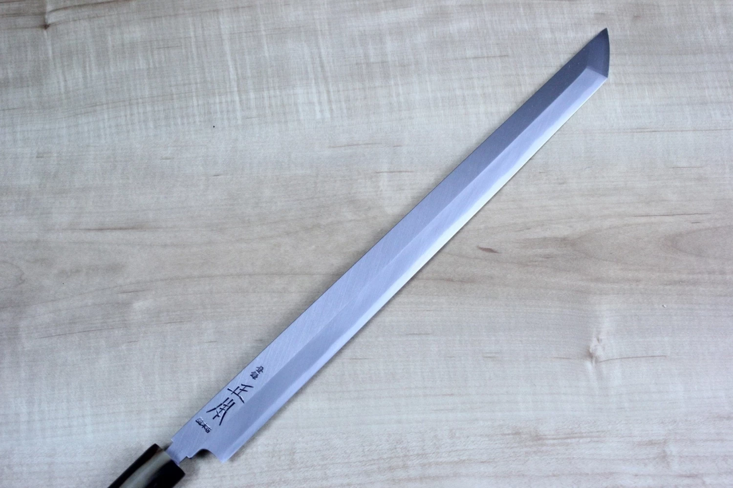 The Sakimaru Takohiki is a variation of the Yanagiba and Takohiki, and is used for much the same purposes. Sakimaru Takohiki is easily identifiable by their blade tips, which look similar to that of a Katana. Their blades have a straight spine similar to the Takohiki, and a slightly curved edge like the Yanagiba, resulting in a knife, which looks somewhat like a combination of the two.