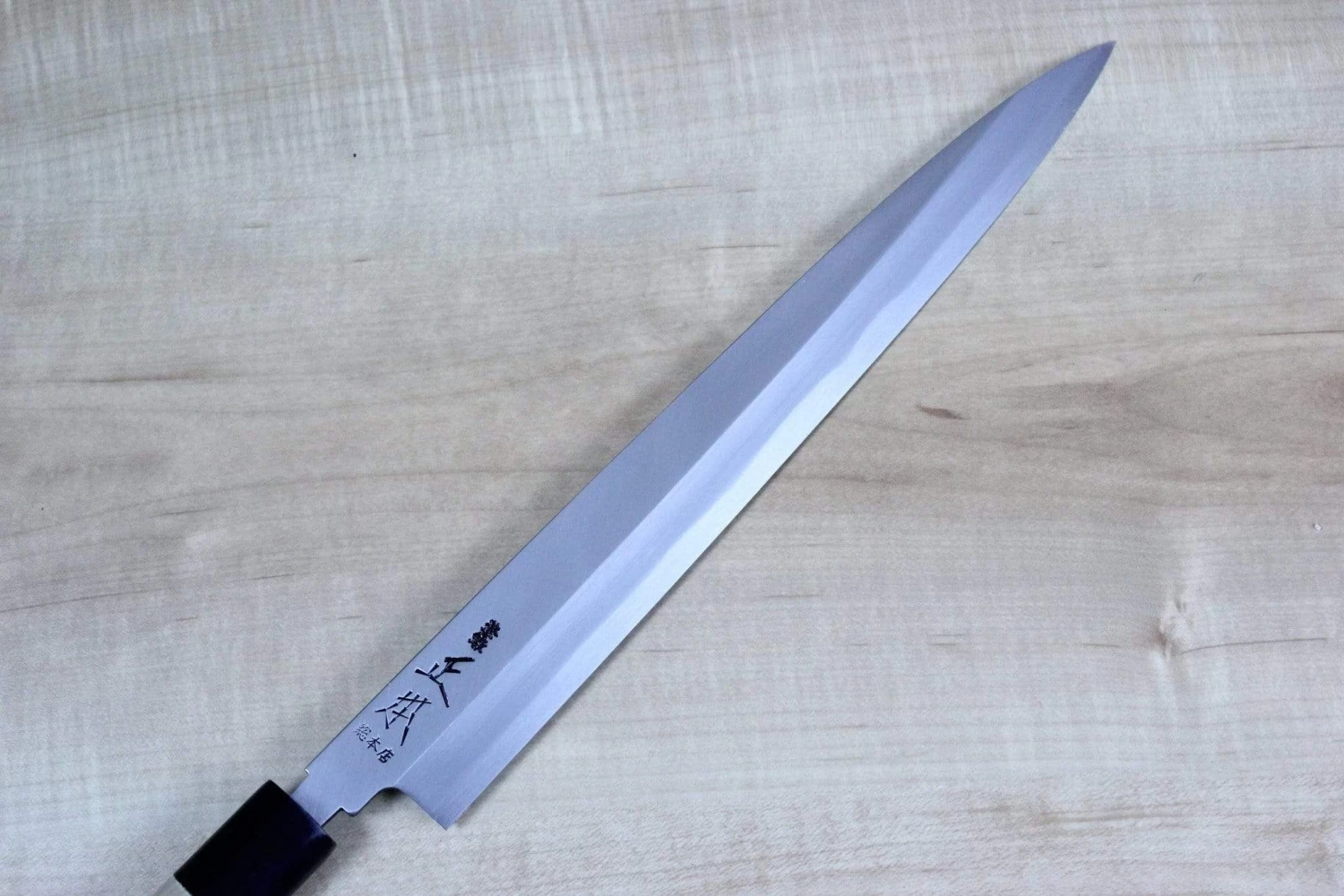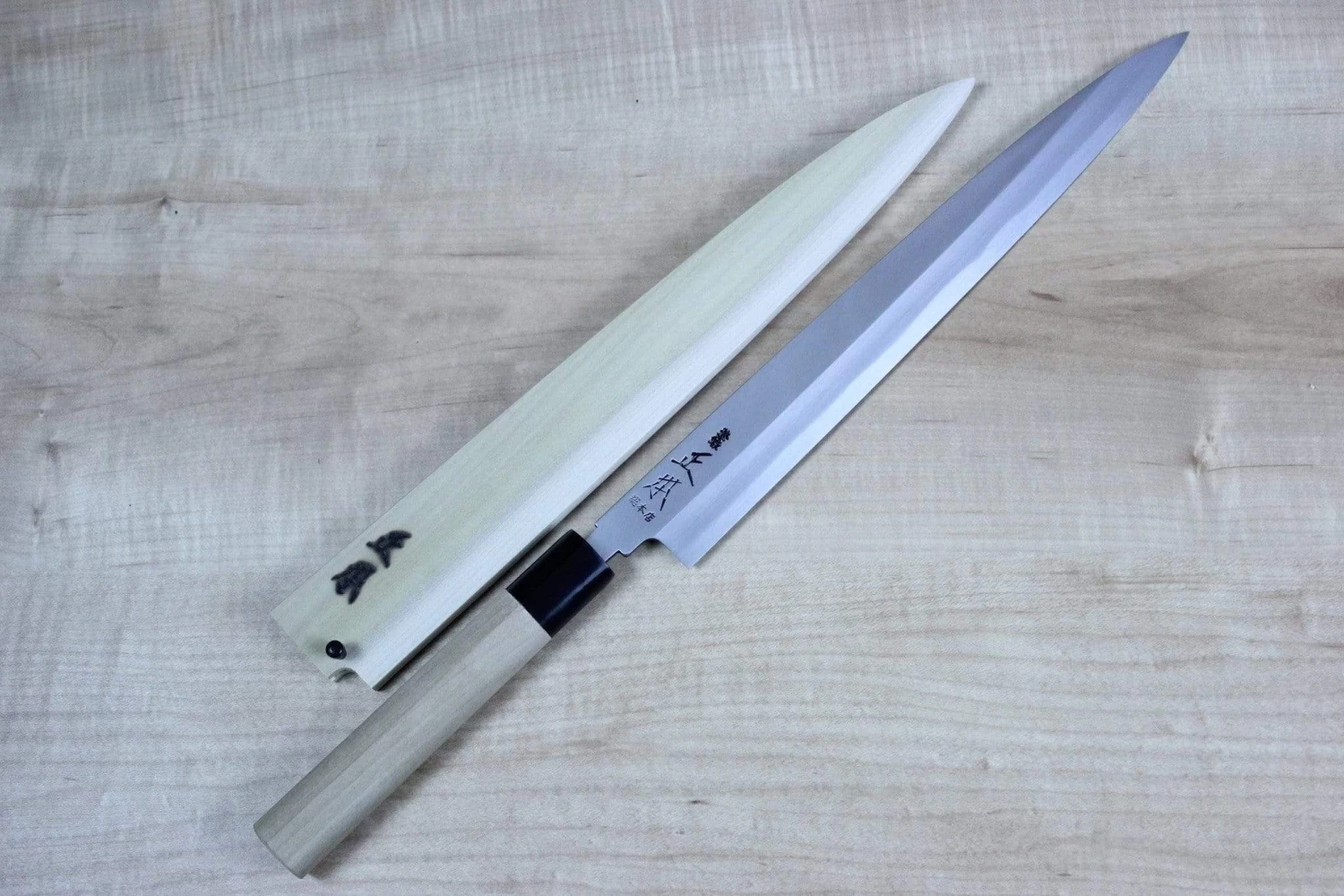 Yanagiba knives are primarily used to slice boneless fish fillets for Sashimi and Sushi dishes, but they can also be used to fillet small to medium-sized fish and are often used for skinning fish. The narrow blade and relatively acute edge angle of the Yanagiba are features, which greatly reduce the effort required to cut through ingredients. As with the Sujihiki, the long blade allows the fish to be cut in one single drawing motion, from heel to tip.
