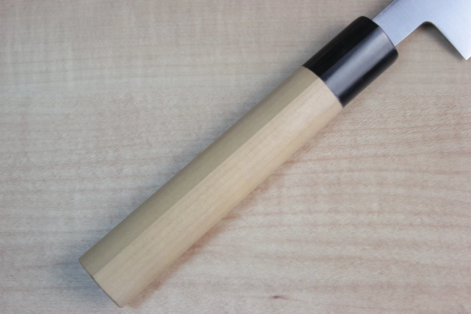 Each knife is fitted with a traditional Japanese ‘D-shaped’ magnolia wood handle with a water buffalo horn ferrule / collar and also includes a matching magnolia wood Saya (Sheath) for safekeeping.