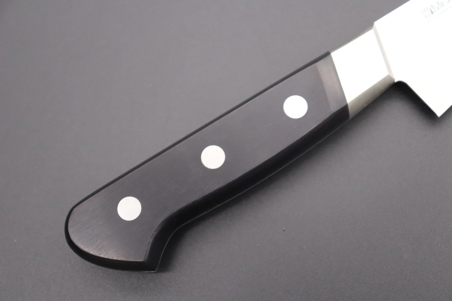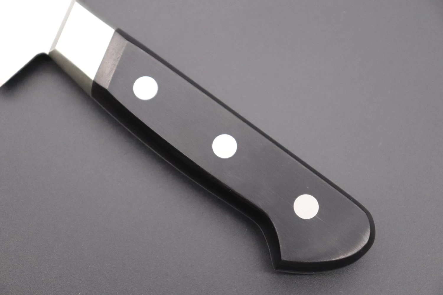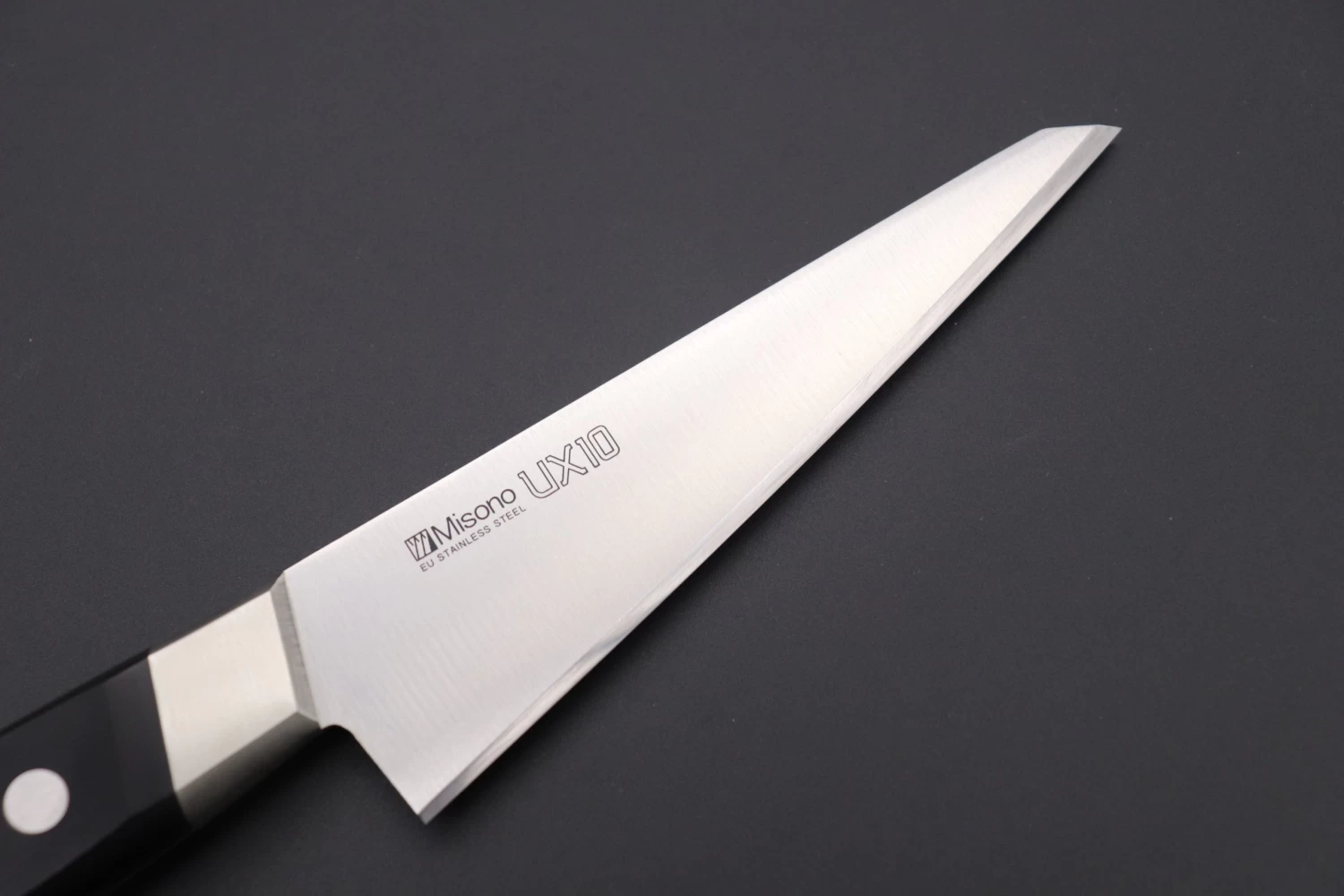Using a high purity special stainless steel produced by a Swedish steel company, Misono has combined time-tested tradition techniques with new technological advances to create their ultimate line of stainless steel Chef’s knives. The UX10 Series have exceptionally rust-resistant blades yet, just like high carbon steel knives, they offer extremely sharp edges and are easy to re-sharpen (HRc. 59-60). Perfect balance and grip is provided by using full tang construction, water-resistant black pakkawood (Resin impregnated wood composite) handle scales and a nickel silver bolster, which adds a stylish accent.