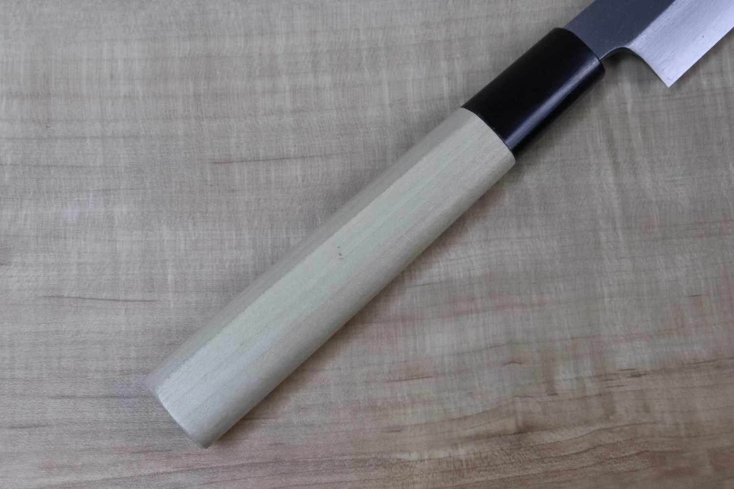 This knife is fitted with a traditional Japanese ‘D-shaped’ magnolia wood handle with a water buffalo horn ferrule / collar. This knife also includes a matching magnolia wood Saya (Sheath) for safekeeping.
