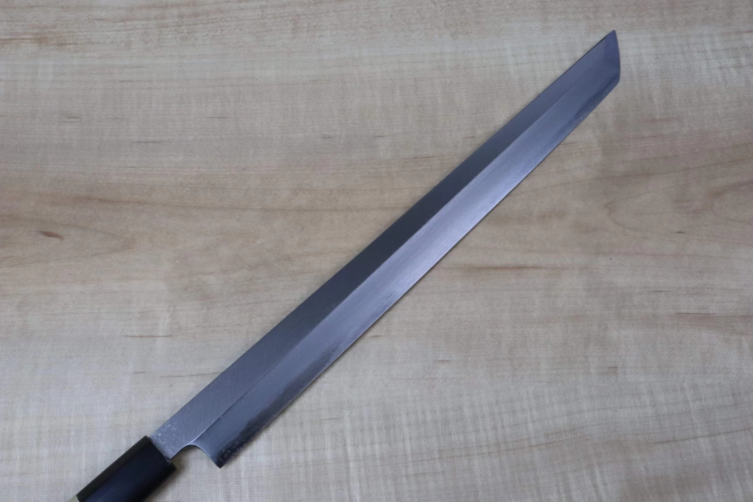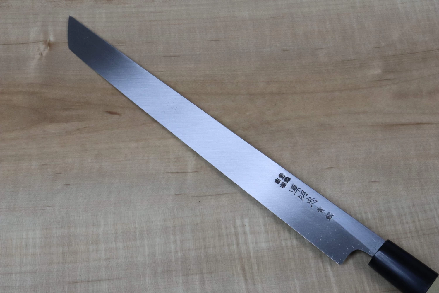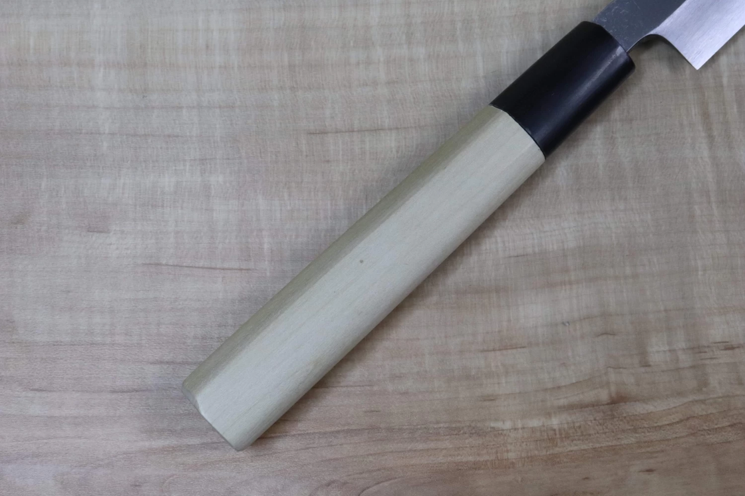 The Sakimaru Takohiki is a variation of the Yanagiba and Takohiki, and is used for much the same purposes. Sakimaru Takohiki are easily identifiable by their blade tips, which look similar to that of a Katana. Their blades have a straight spine similar to the Takohiki, and a slightly curved edge like the Yanagiba, resulting in a knife which looks somewhat like a combination of the two.