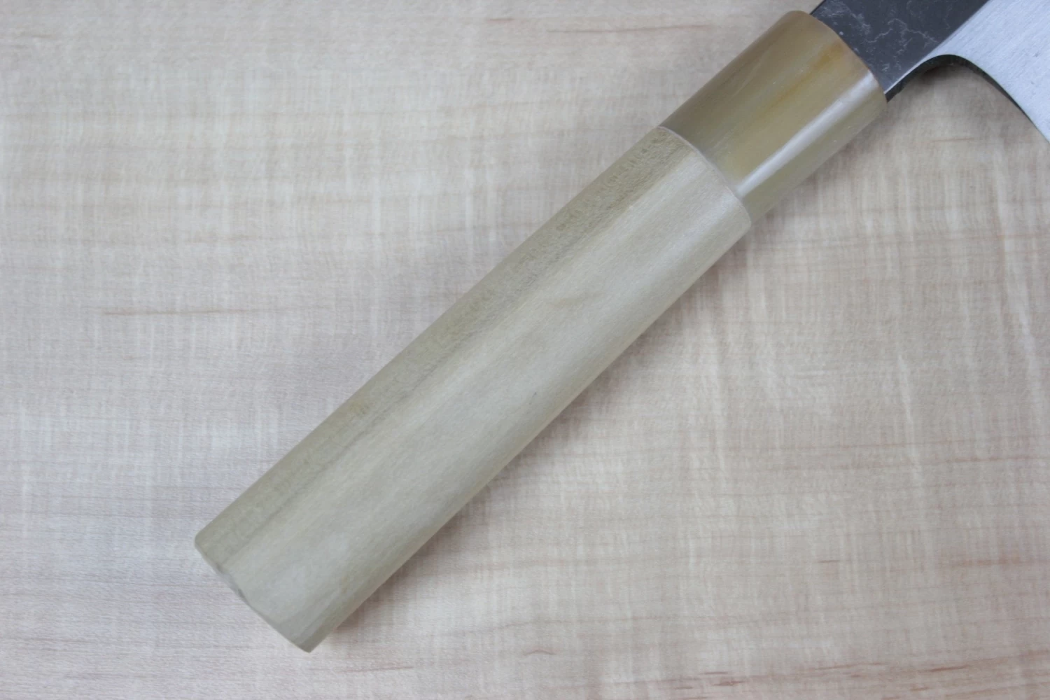Unfortunately, Mizuno Tanrenjo and most other knife makers are now struggling to find the raw materials to make White or Marbled Water Buffalo Horn Ferrules for their knife handles.