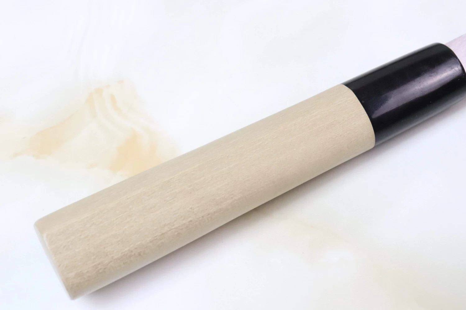 Unfortunately, Mizuno Tanrenjo and most other knife makers are now struggling to find the raw materials to make White or Marbled Water Buffalo Horn Ferrules for their knife handles.