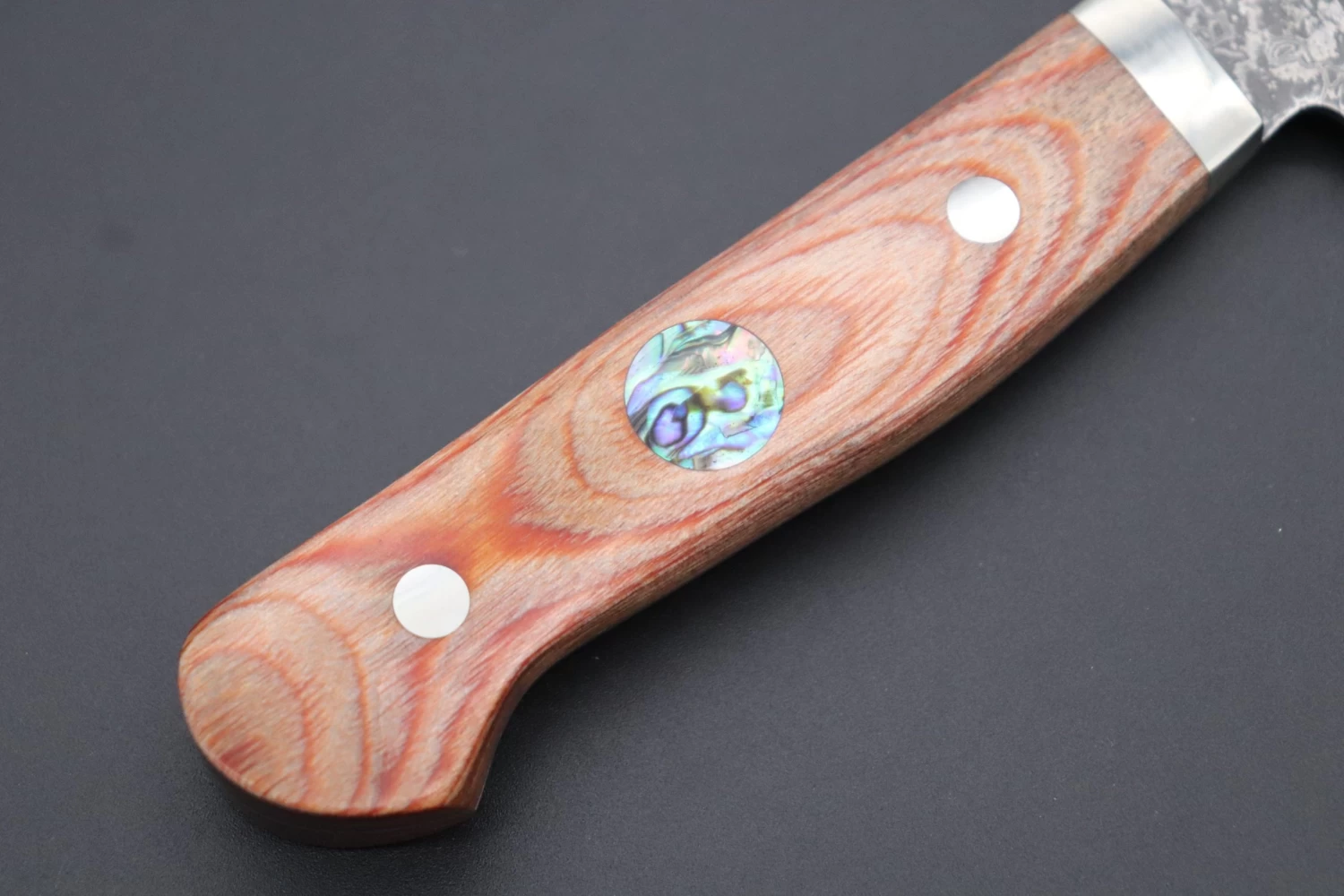 Like many other high-end custom knife makers, Mr. Itou hand tapers the blade tang to reduce weight and perfectly balance the blade and handle. He also contours and polishes the handle to ensure a perfect grip and an attractive finish.The fine, unique handle of this knife is made with Brown Wood-Micarta and it has been custom inlaid by Mr. Itou with a handcrafted Circle of beautiful Abalone. As the Full-Moon shines in the Winter Evenings, Mr. Itou’s “Luna Series” knives and their Custom Inlaid Handles will be especially distinctive and magical.