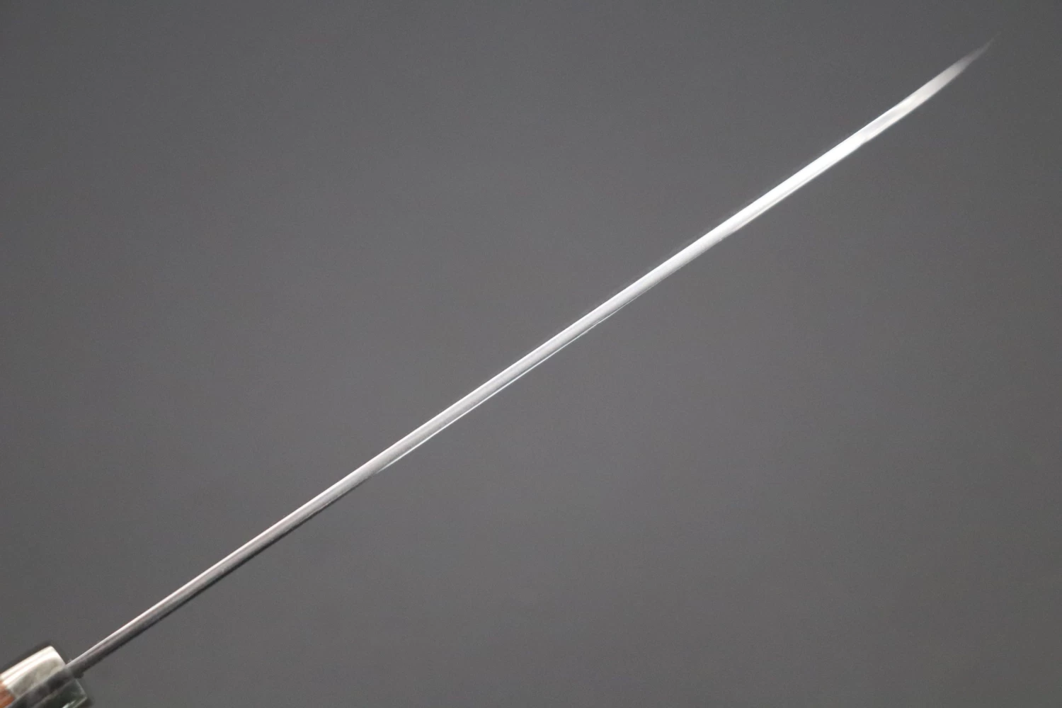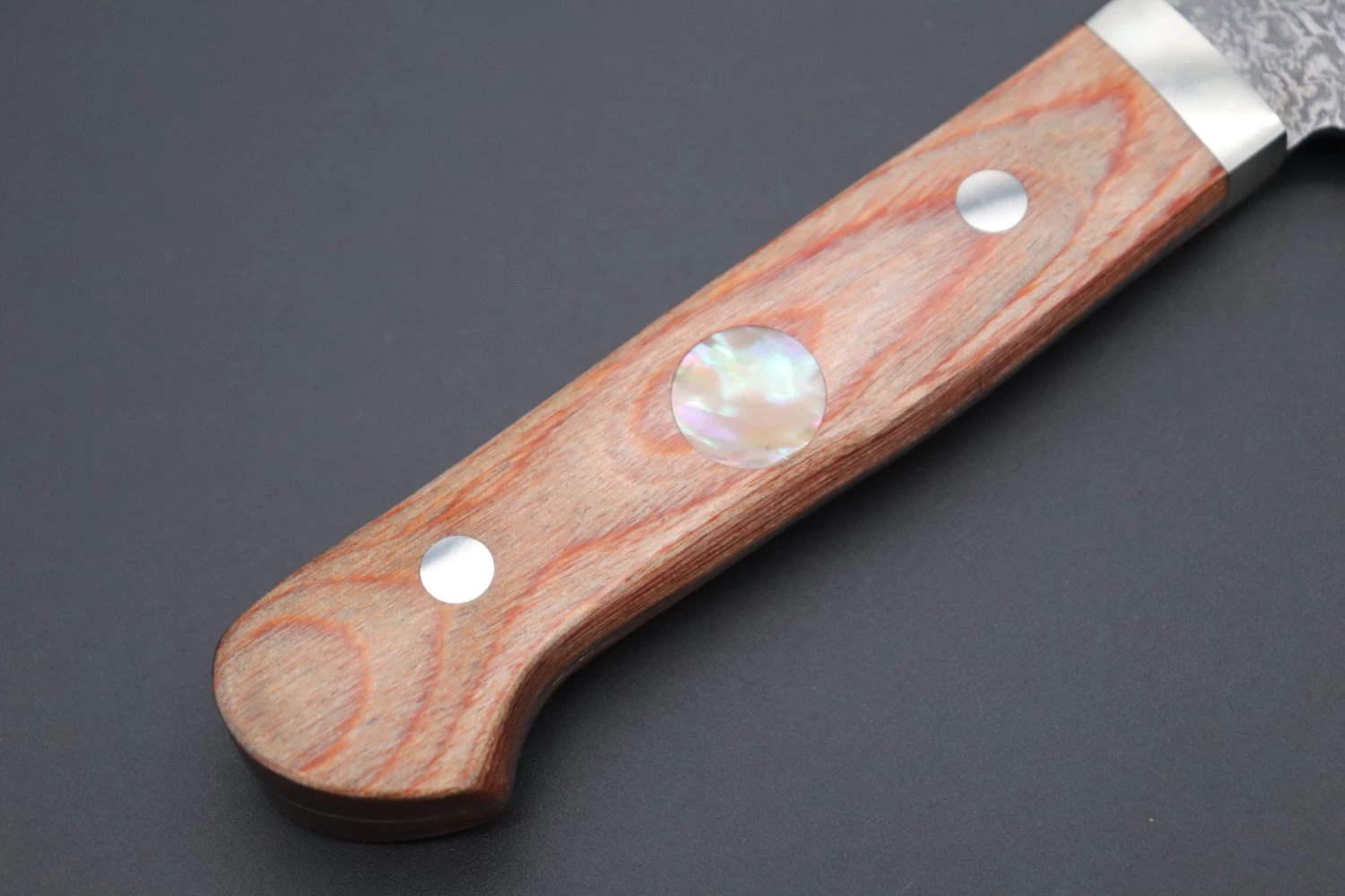 Like many other high-end custom knife makers, Mr. Itou hand tapers the blade tang to reduce weight and perfectly balance the blade and handle. He also contours and polishes the handle to ensure a perfect grip and an attractive finish.The fine, unique handle of this knife is made with Brown Wood-Micarta and it has been custom inlaid by Mr. Itou with a handcrafted Circle of beautiful White Abalone. As the Full-Moon shines in the Winter Evenings, Mr. Itou’s “Luna Series” knives and their Custom Inlaid Handles will be especially distinctive and magical.