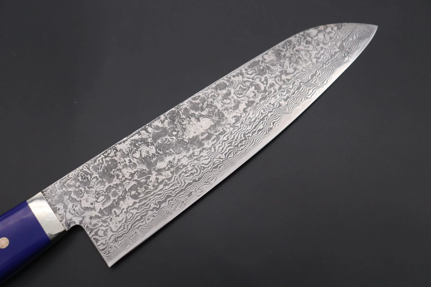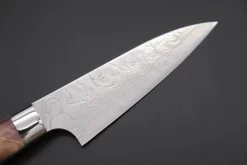 Mr. Itou uses R-2 Powdered High Speed Tool Steel for the cutting edge of his knives (HRc. 62) and he also creates the incredibly beautiful and powerful appearance Damascus knives.