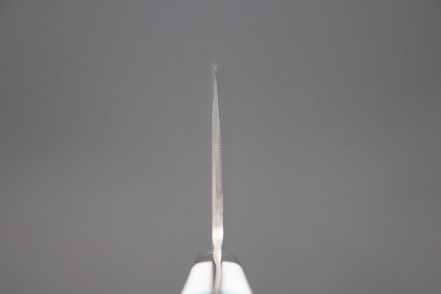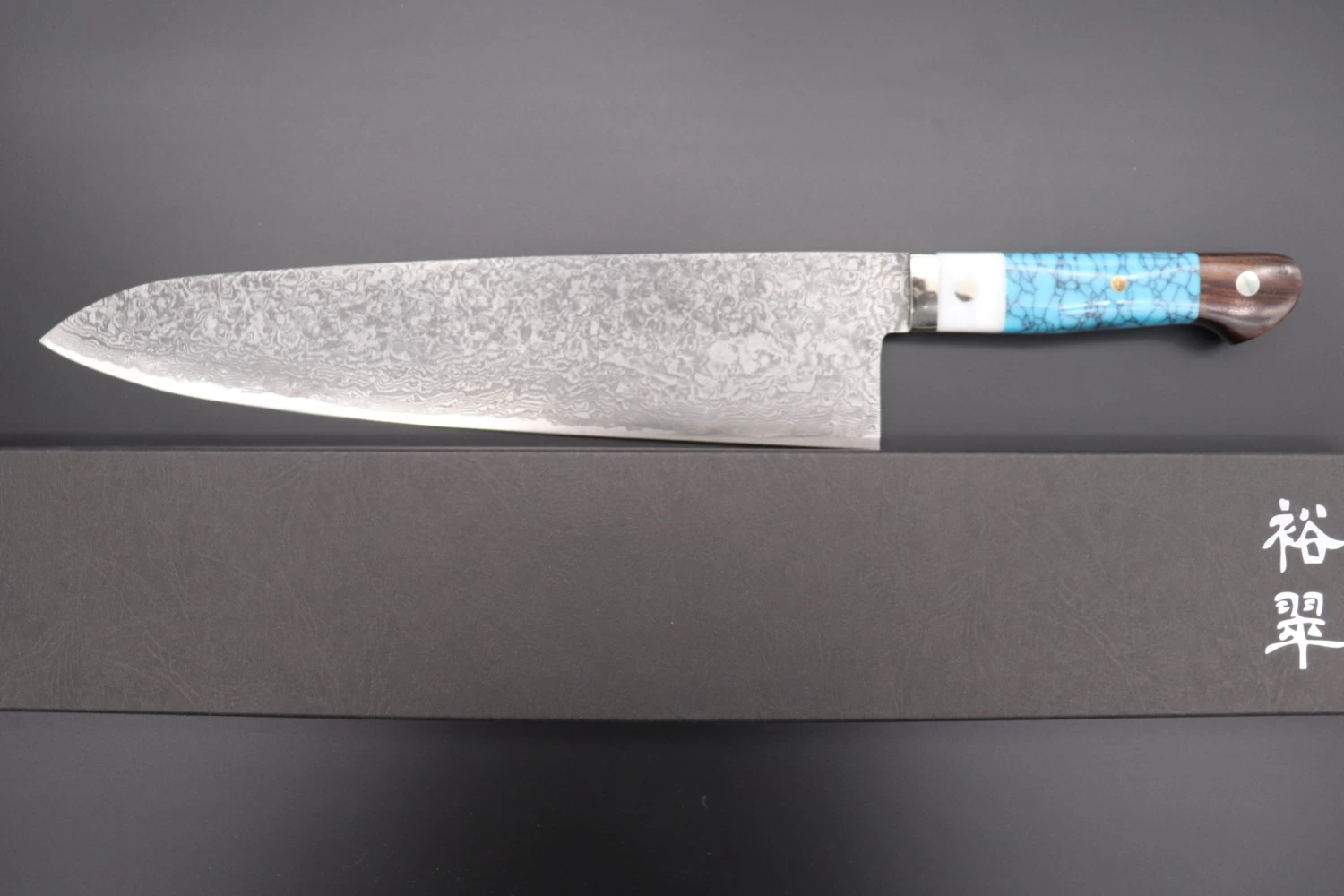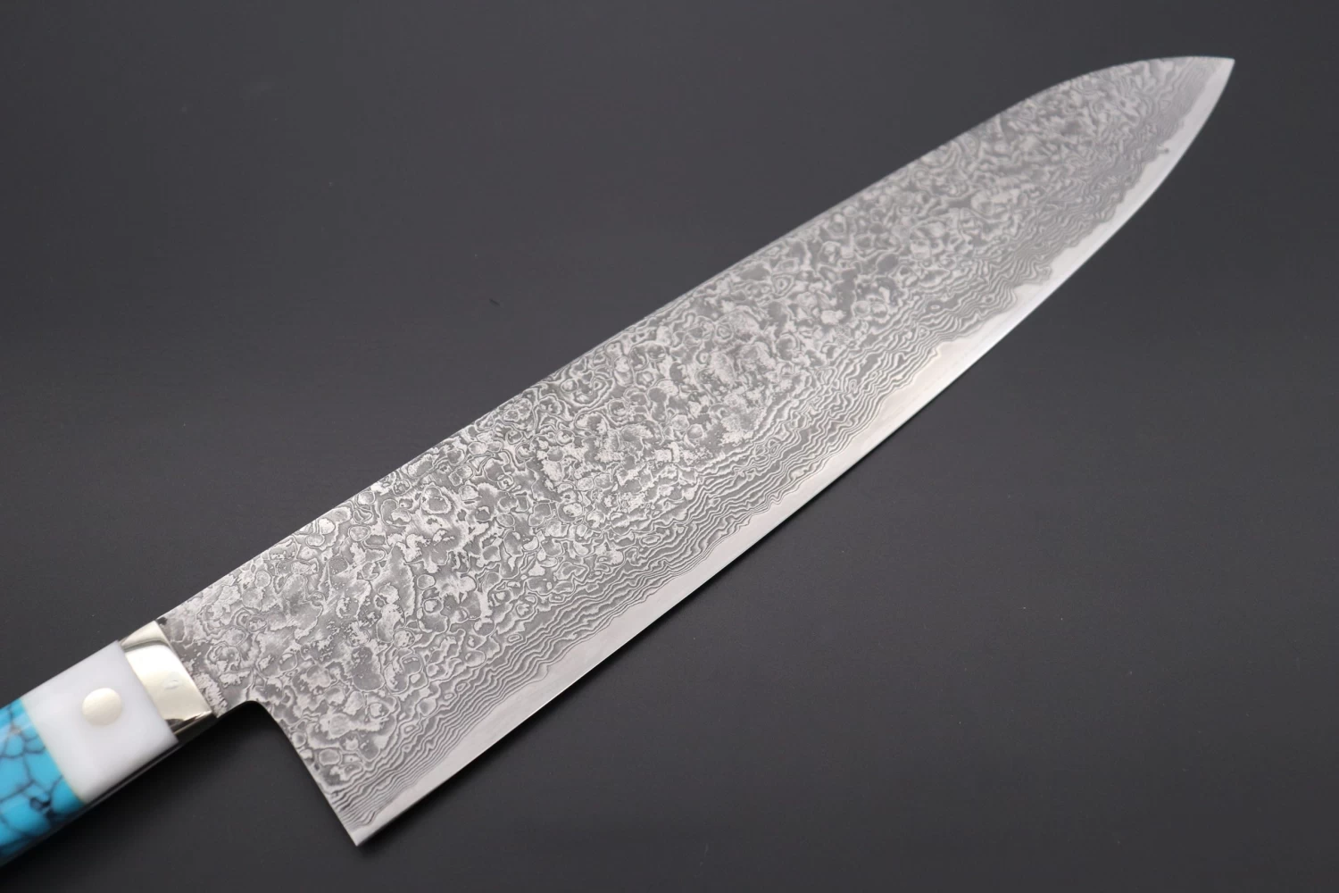 Mr. Itou’s original design concept for this knife was to make an especially beautiful and unique Custom Combination Handle (Corian/Turquoise/IronWood), which is visually vivid and impressive. Mr. Itou explained that making the Custom Combination Handle ‘seamless’, with excellent fit&finish, is a time-consuming process and requires extra skill and attention.