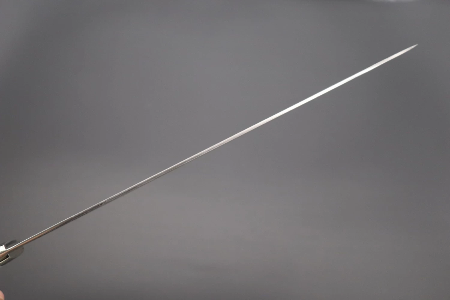 As seen on other expensive full tang custom knives, Mr. Itou hand tapers the blade tang in order to reduce weight and to perfectly balance the blade and handle. He contours and polishes the handle to ensure a perfect grip and an attractive finish.