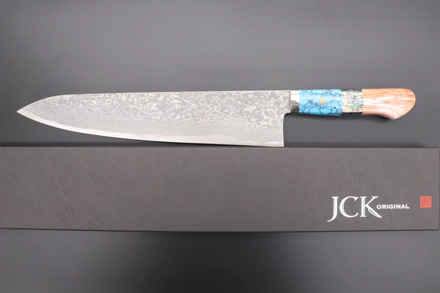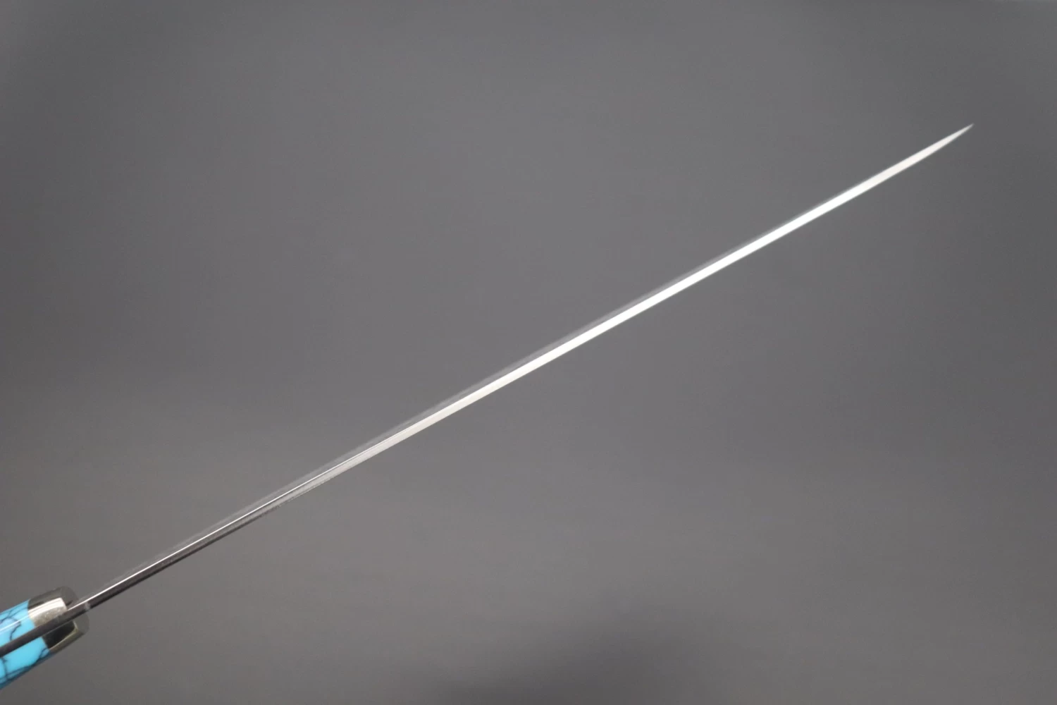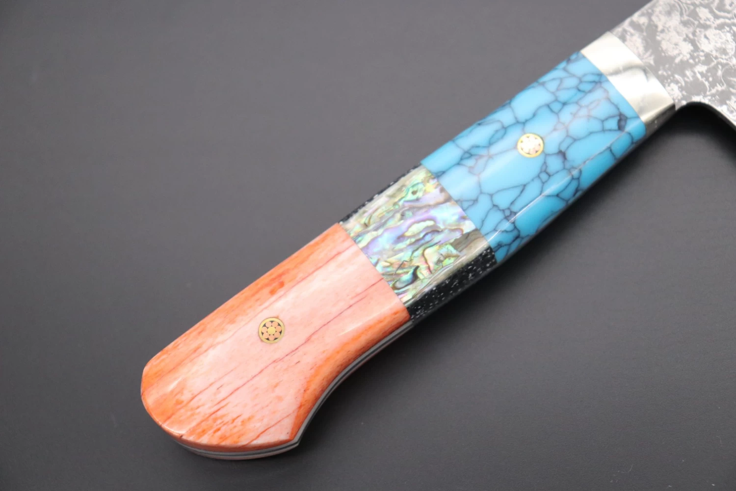 Mr. Itou’s original design concept for this knife was to make an especially beautiful and unique Custom Combination Handle (Turuqoise Gem-Composite Stone/Abalone/Orange Color Camel Bone), which is visually vivid and impressive. Mr. Itou explained that making the Custom Combination Handle ‘seamless’, with excellent fit&finish, is a time-consuming process and requires extra skill and attention.