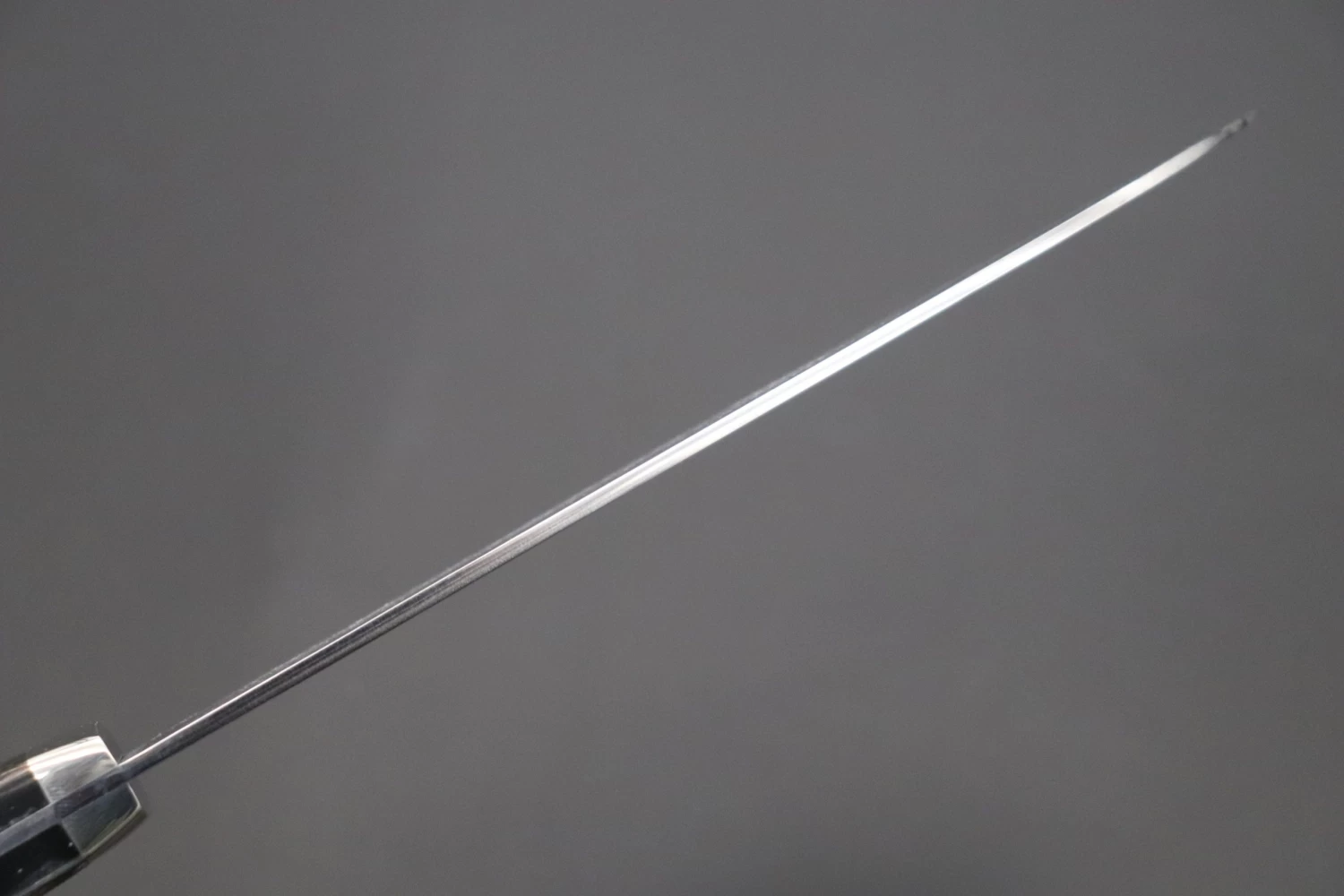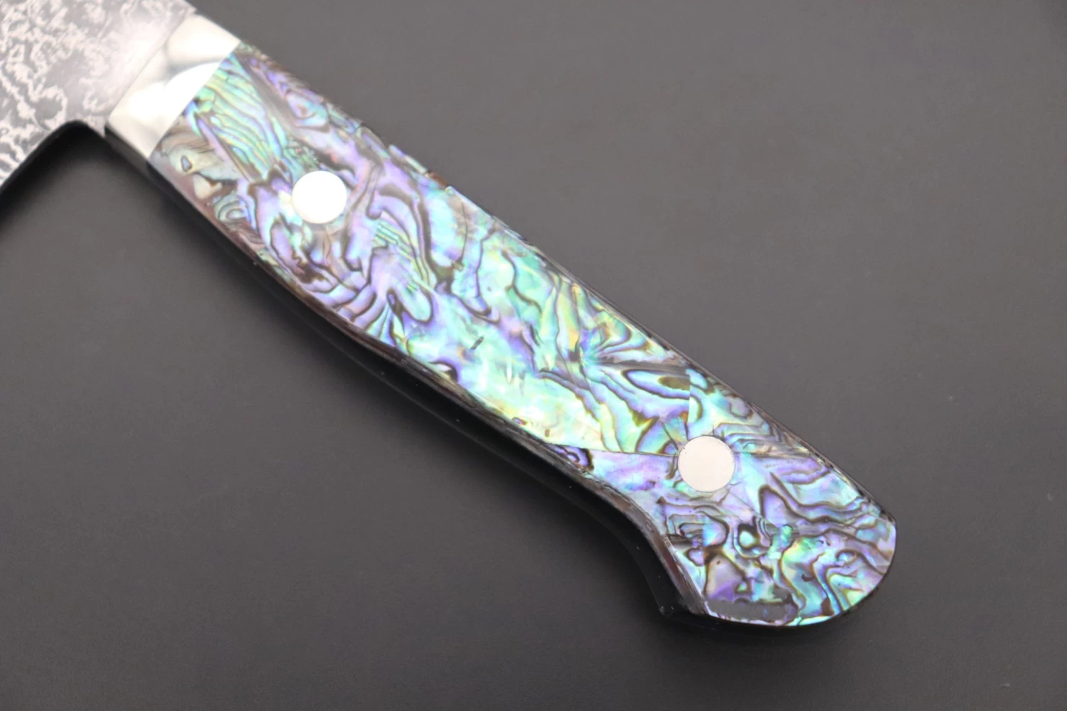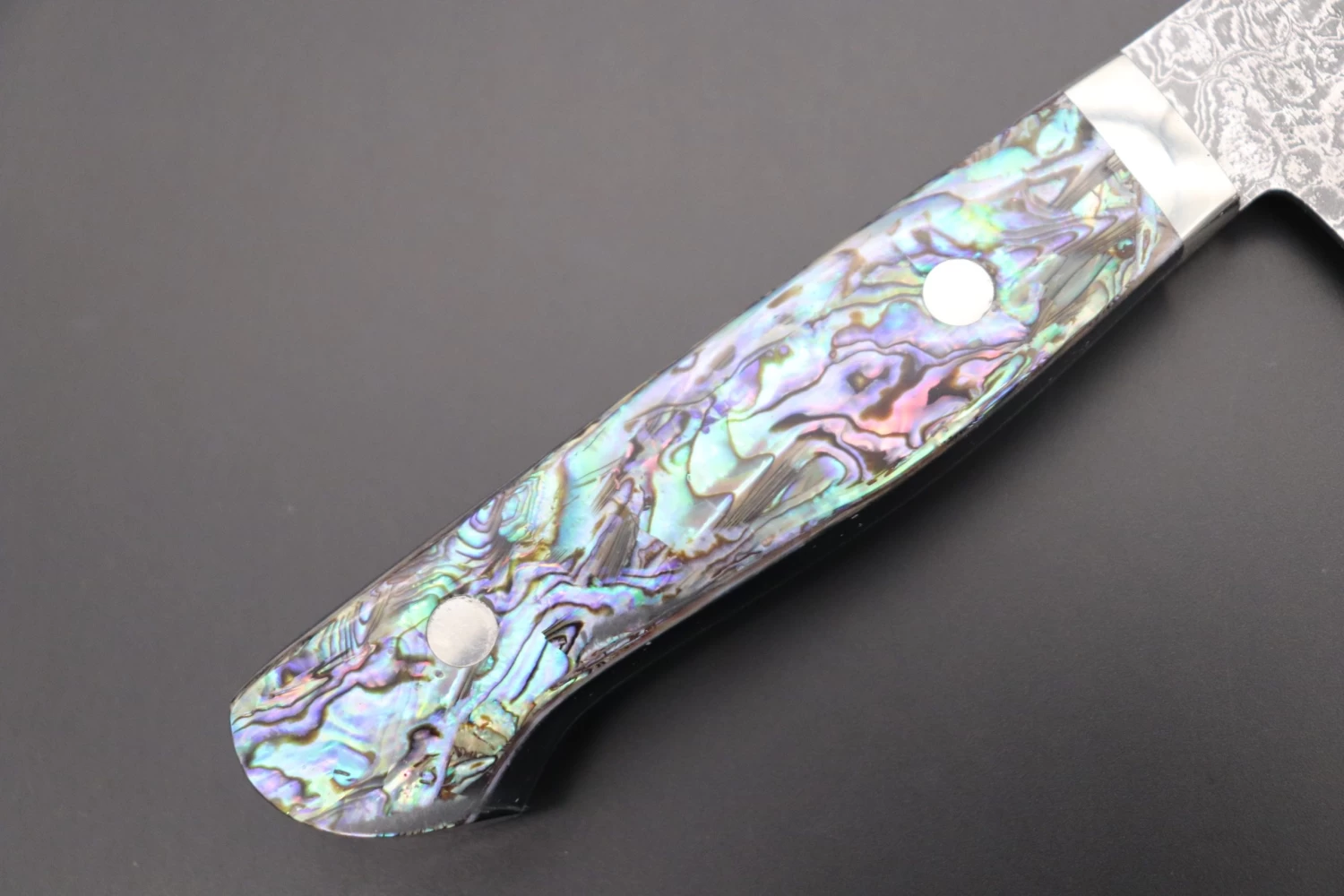 As seen on other expensive full tang custom knives, Mr. Itou hand tapers the blade tang in order to reduce weight and to perfectly balance the blade and handle. He contours and polishes the handle to ensure a perfect grip and an attractive finish. This knife comes with beautiful and good strength, Mr. Itou’s Original Abalone Handle.