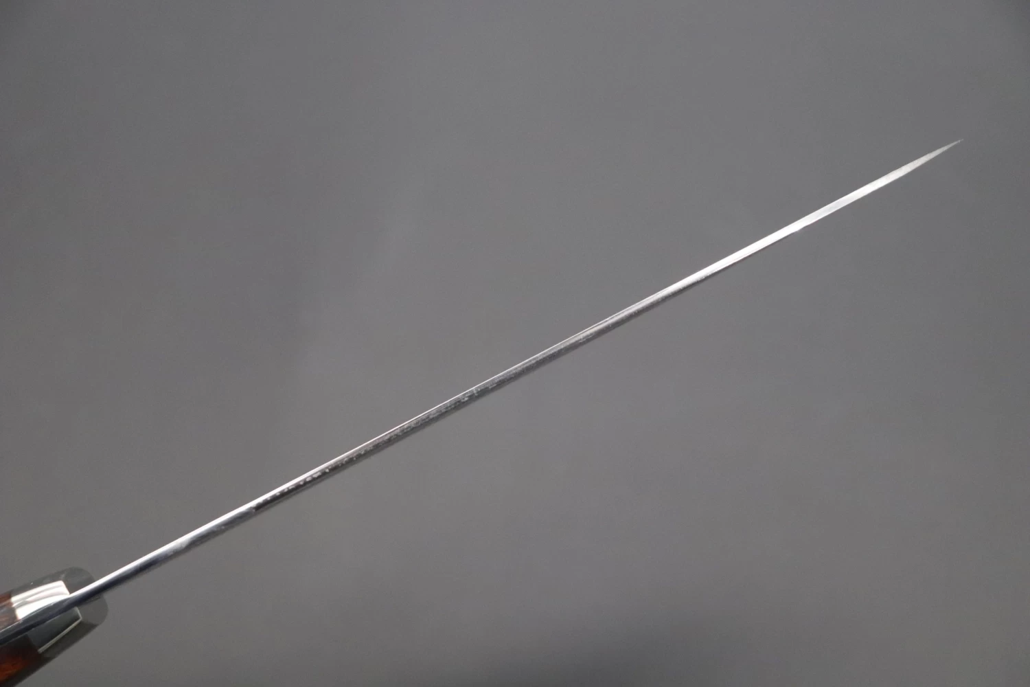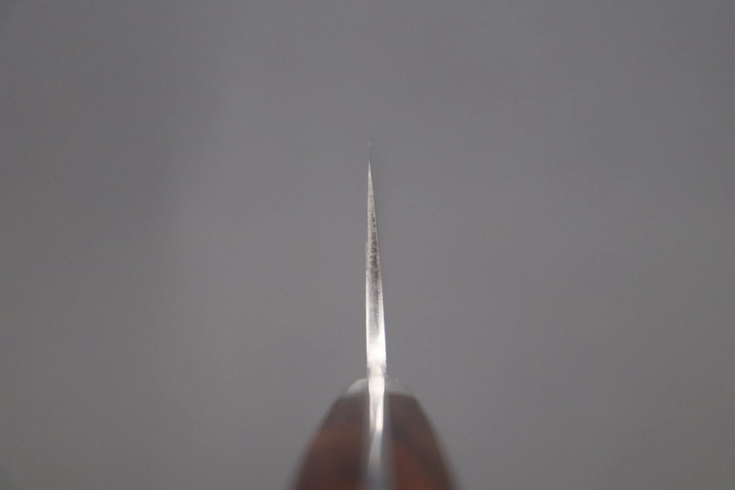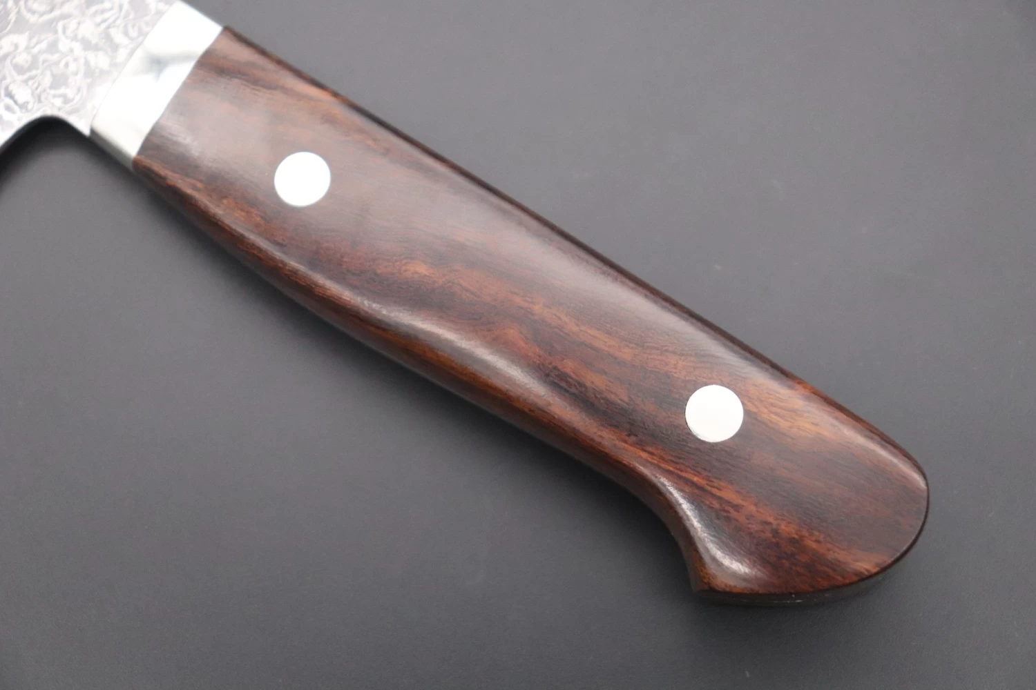 As seen on other expensive full tang custom knives, Mr. Itou hand tapers the blade tang in order to reduce weight and to perfectly balance the blade and handle. He contours and polishes the handle to ensure a perfect grip and an attractive finish. This knife comes with nice texture and strength of Ironwood Handle.