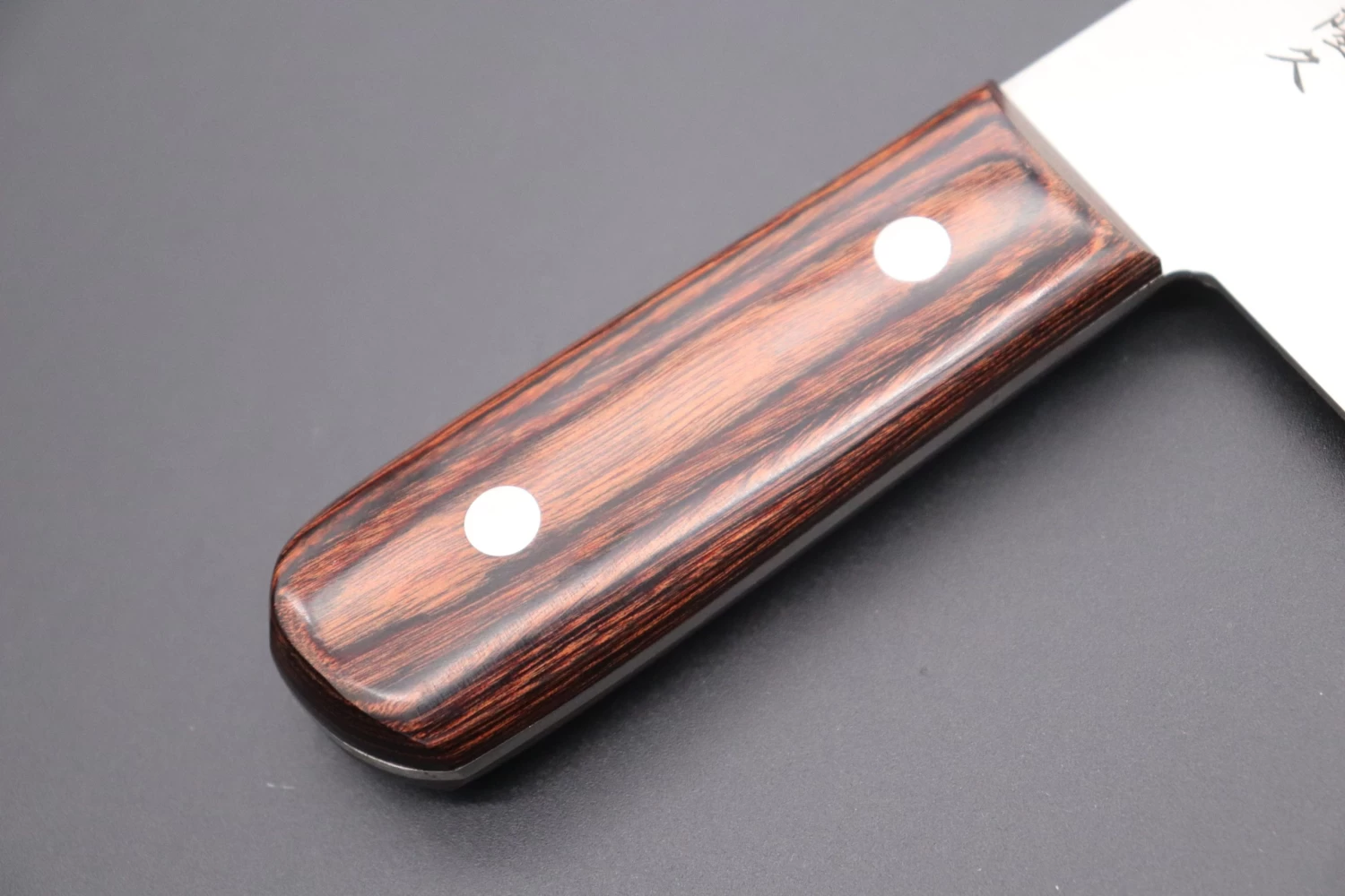 This is the new model of Suien Chinese Cleaver, its blade is made of high quality Japanese Stainless steel VG-10. VG-10 is a high performance stainless cutlery steel that is famous for its combination of very good edge sharpness, edge retention, and high corrosion resistance. HRC60 to 61.