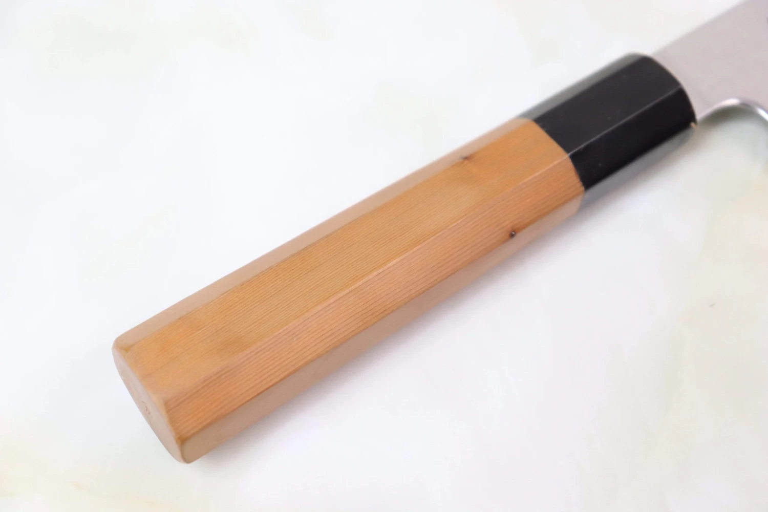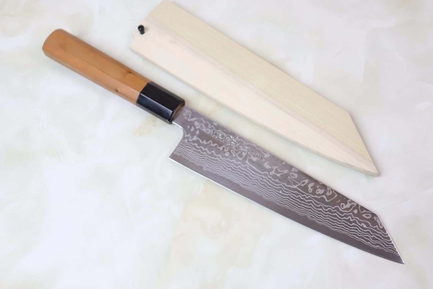 This knife has a comfortable Octagonal Japanese Yew Wood Handle, which has a buffalo horn ferrule. For safekeeping, each knife comes with a matching magnolia wood Saya (Sheath) with a black pakkawood Saya pin. Japanese Yew Wood often has been used for the Wa Handles from long time ago. It has smooth surface and makes comfortable touch, grip and strength.