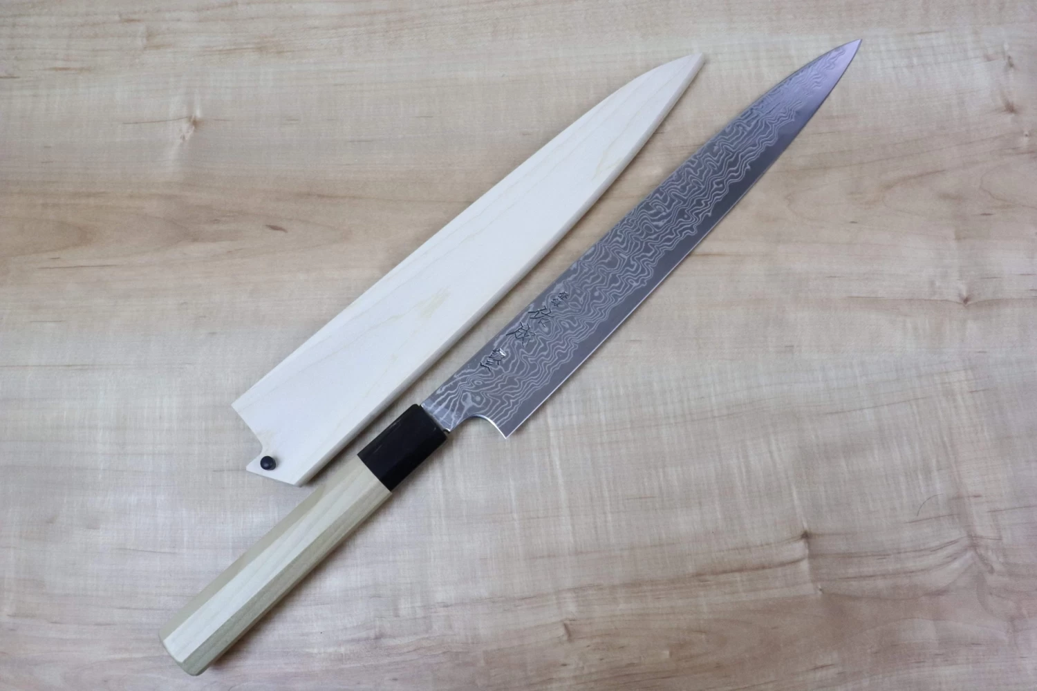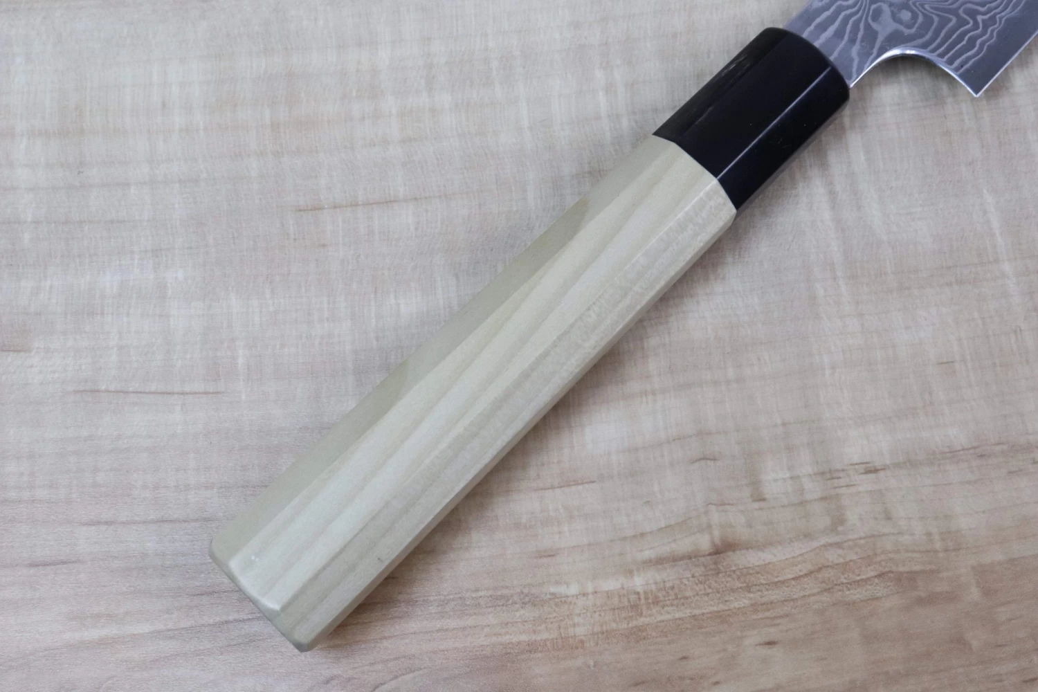 This beautiful Damascus Wa Sujihiki is forged and hand crafted by passionate forge-smith Sukenari using Gingami No.3 steel (HRC 62).